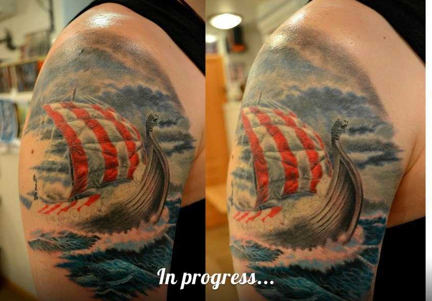 Еще одна классика жанра когда корабль плывет в закат. Рядом может быть флаг, или надпись о свободе, либо стремлении моряка попасть поскорее домой, к семье. Есть целая серия традиционны татуировок, характерных для русского, американского, или британского флота.