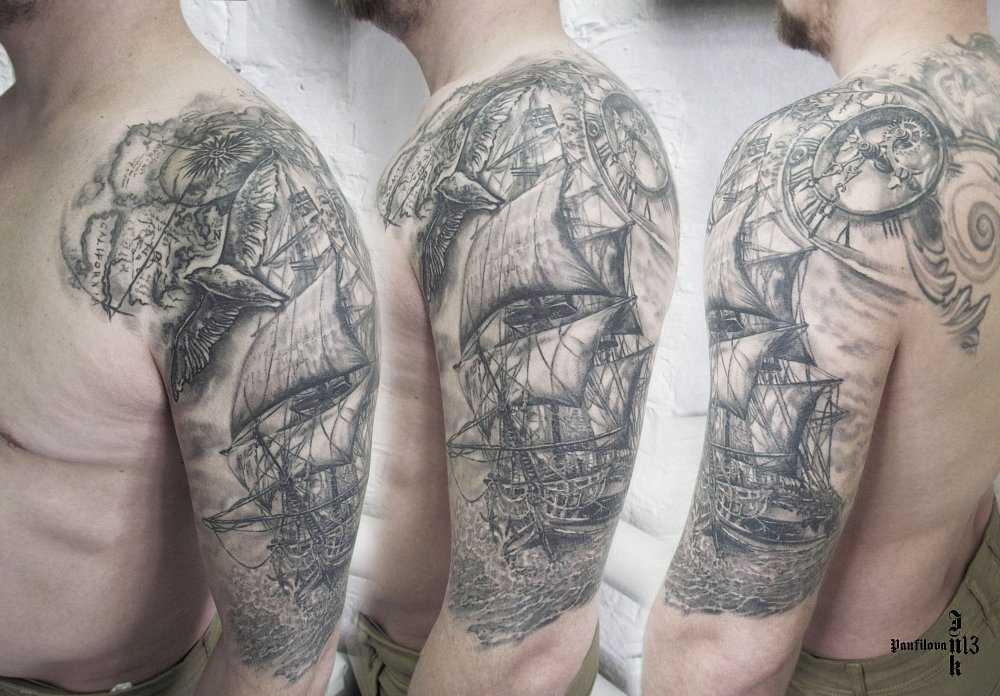 В интернете встречается огромное количество фото тату корабля парусника. Некоторые из них стандартные, такие, как тату корабль призрак – «Летучий голландец». Изорванные паруса, больше похожие на паутины, остов, истерзанный волнами – таков образ вечного морского странника.
