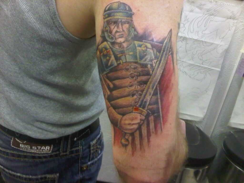 Татуировка гладиатор на руке, пожалуй, самое распространенное решение из всех. Также часто делают её на спине, лопатке, или на боку.