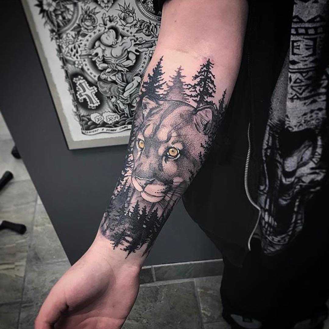 Завораживающие пейзажи с лесными мотивами можно дополнить изображениями животных и птиц. Например, на переднем плане можно изобразить сильное животное, а фоном будет лес. Также лесной массив можно разнообразить другими элементами природы, например, луна, тучи или лучи солнца. Такие нюансы вносят в значение татуировки дополнительный смысл. Часто в таком стиле забиваются целые рукава