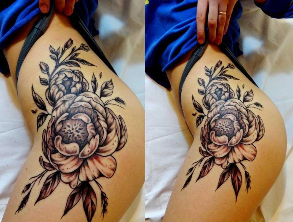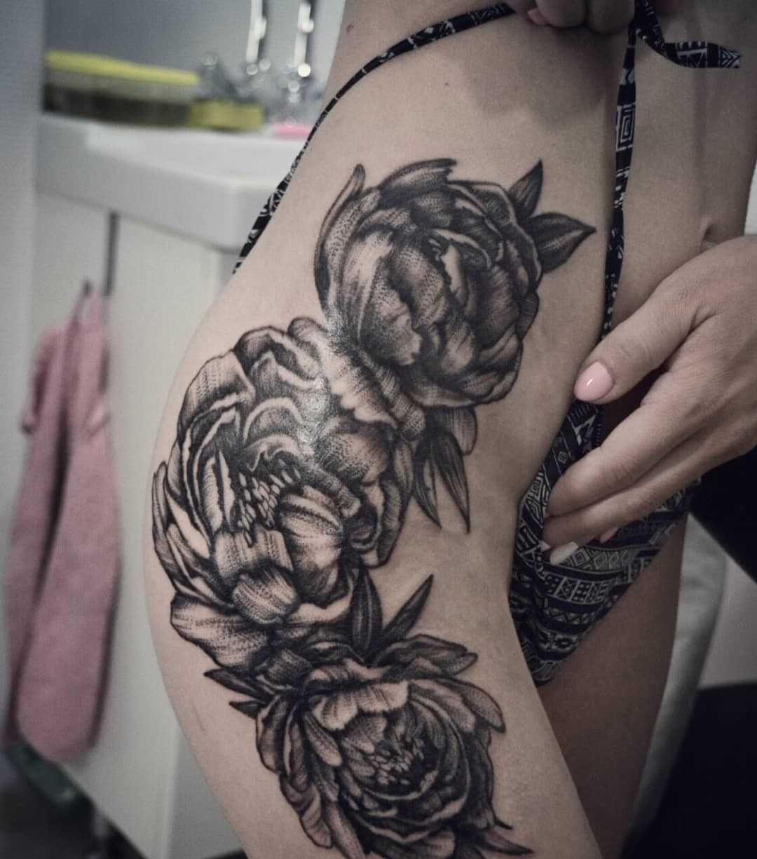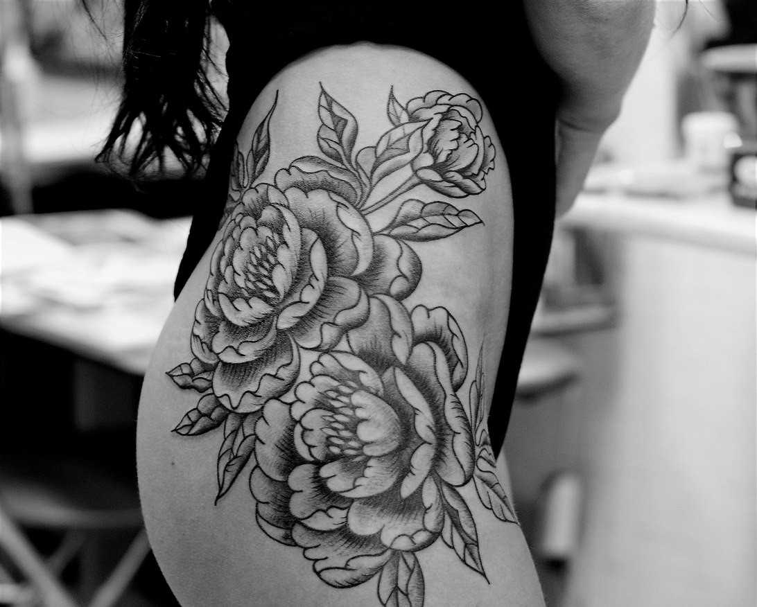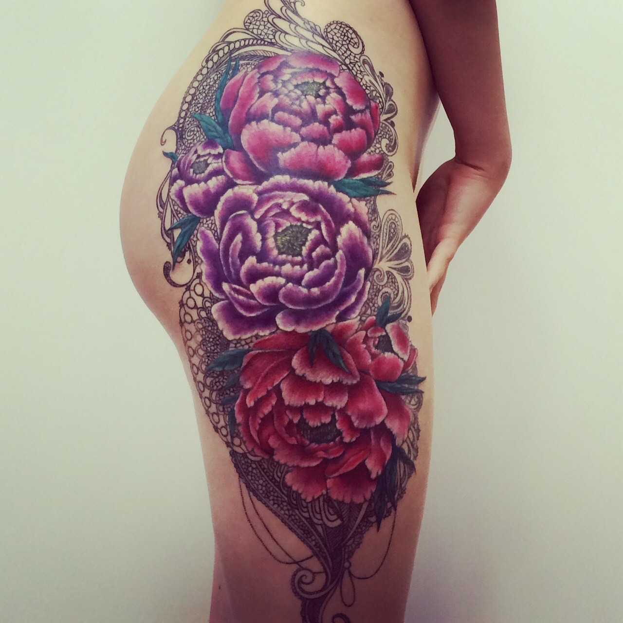 Бедра – оптимальный вариант для тату пион, так как размер участка тела позволяет сделать крупный рисунок, да и смотреться он будет крайне уместно и привлекательно. В большинстве случаев здесь создают целые картины, включающие букеты пион и дополнительные элементы.