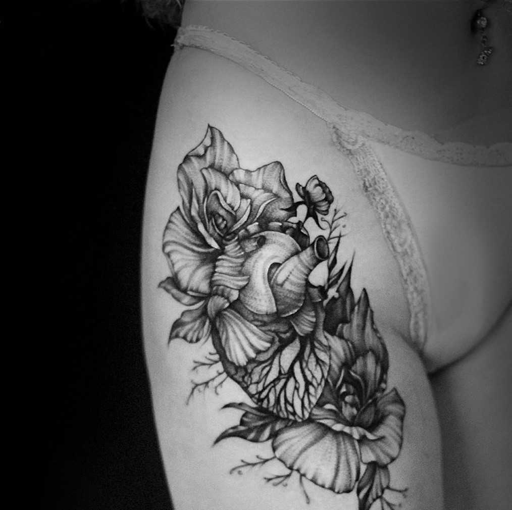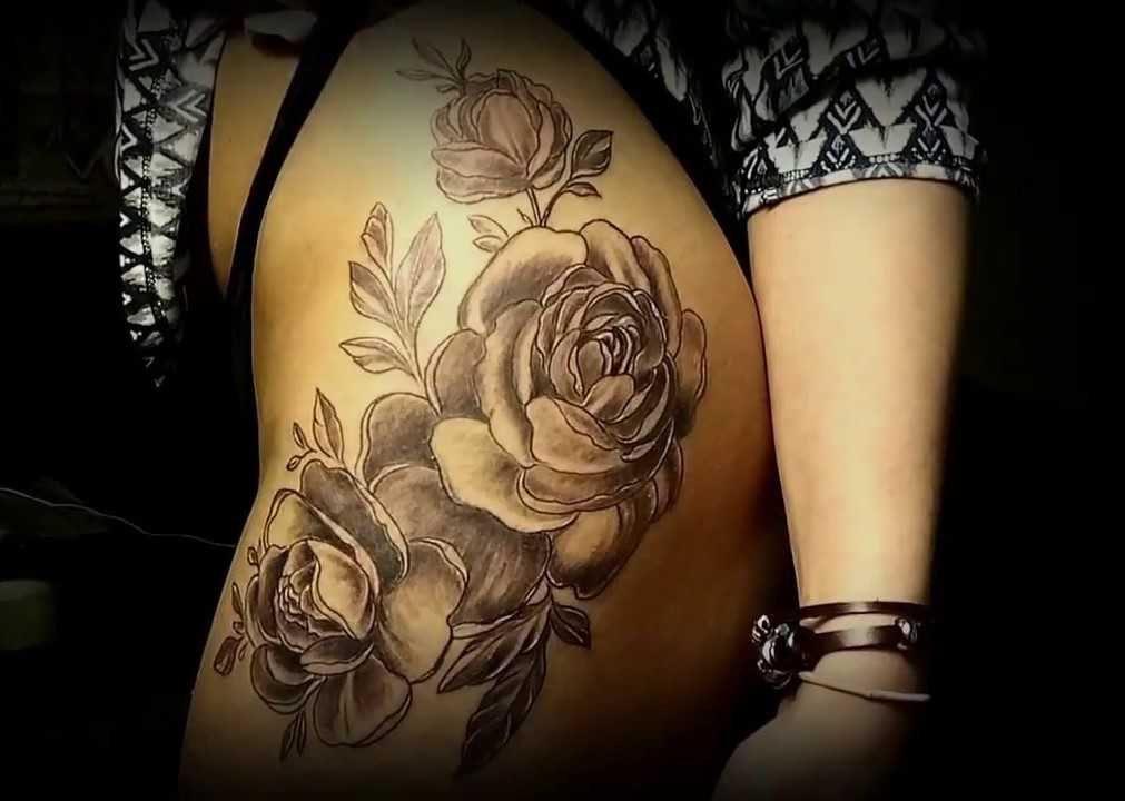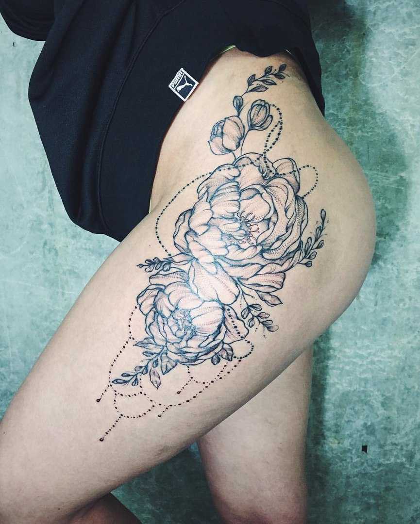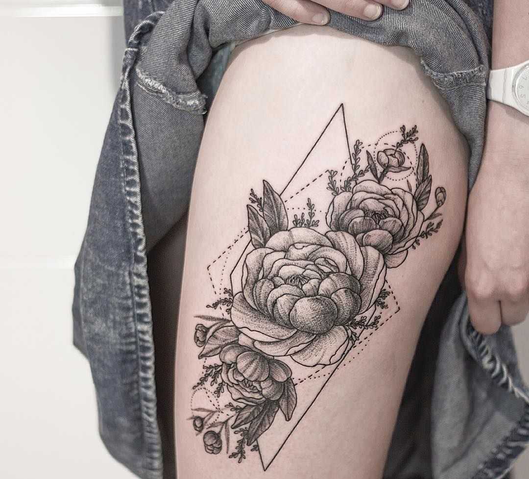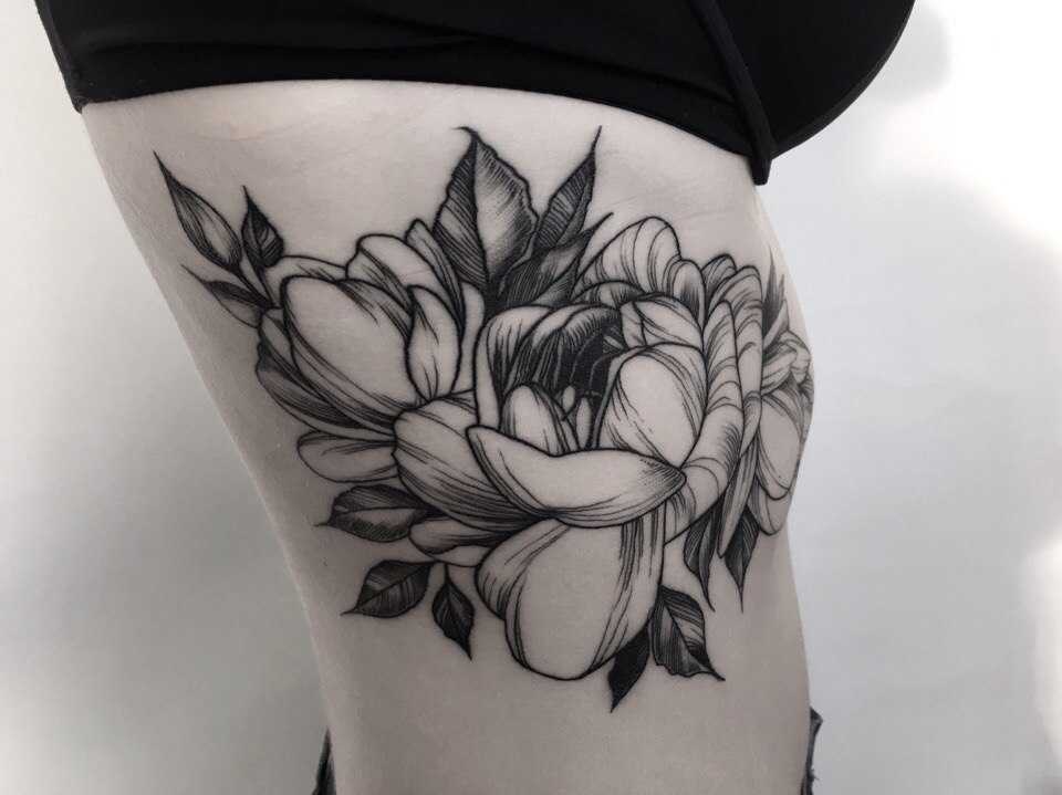 Бедра – оптимальный вариант для тату пион, так как размер участка тела позволяет сделать крупный рисунок, да и смотреться он будет крайне уместно и привлекательно. В большинстве случаев здесь создают целые картины, включающие букеты пион и дополнительные элементы.