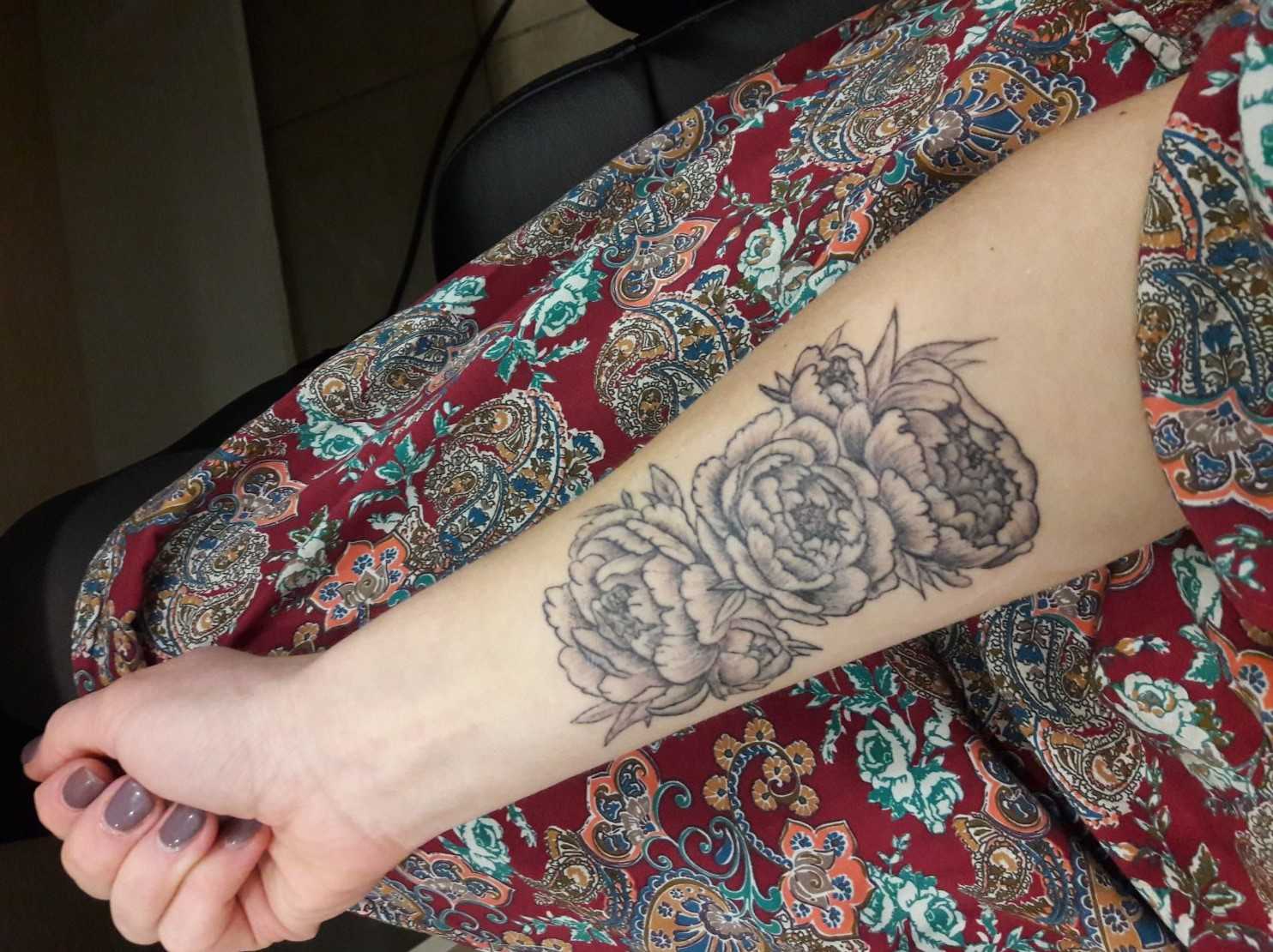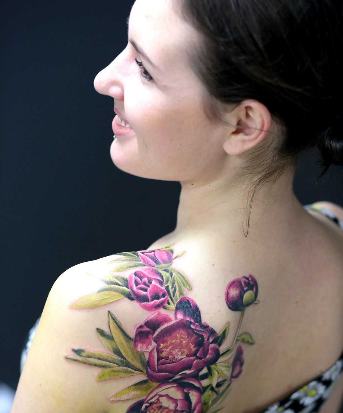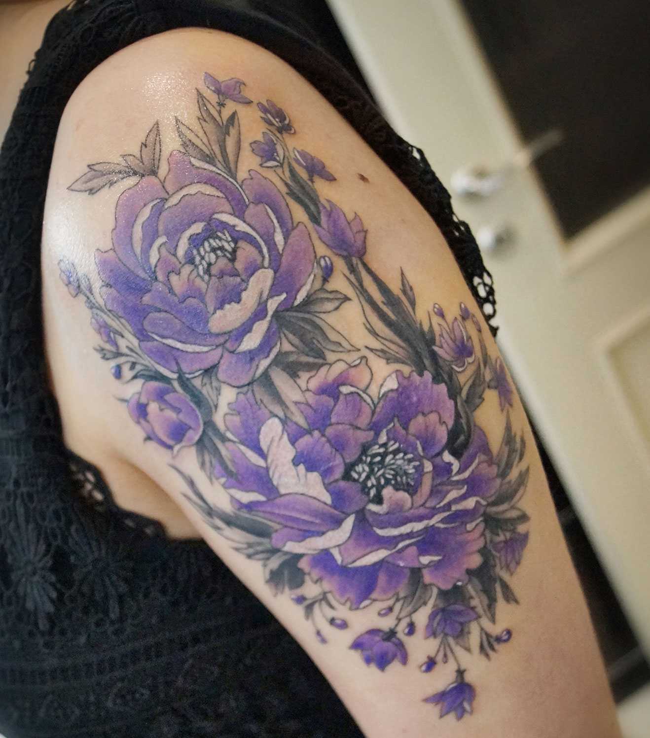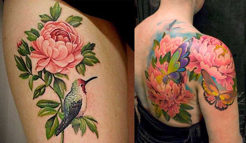 Некоторые девушки накалывают цветные пионы на плече или предплечье, создающие не только яркий акцент в их образе, но и имеющие важное значение для них