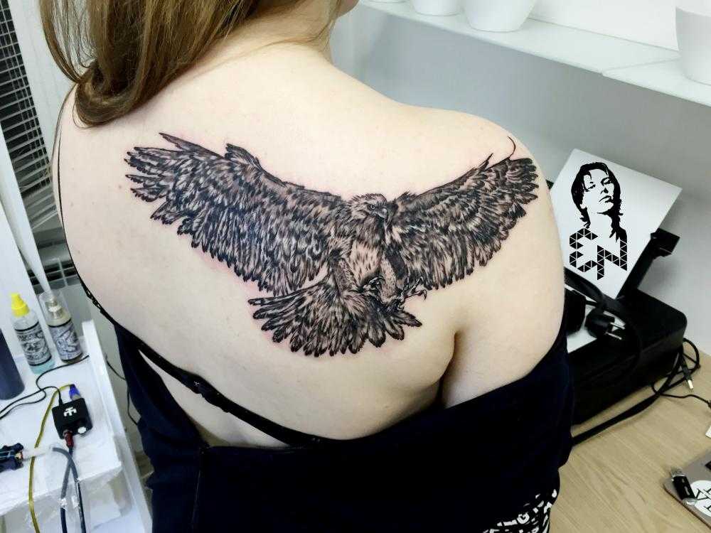 Очень популярный эффектный вариант тату на лопатках для девушек, поскольку этот участок как нельзя лучше подходит для нанесения такого рисунка. Значение наколки зависит от внешнего вида крыльев – какую форму и цвет имеют перья, какой размер: