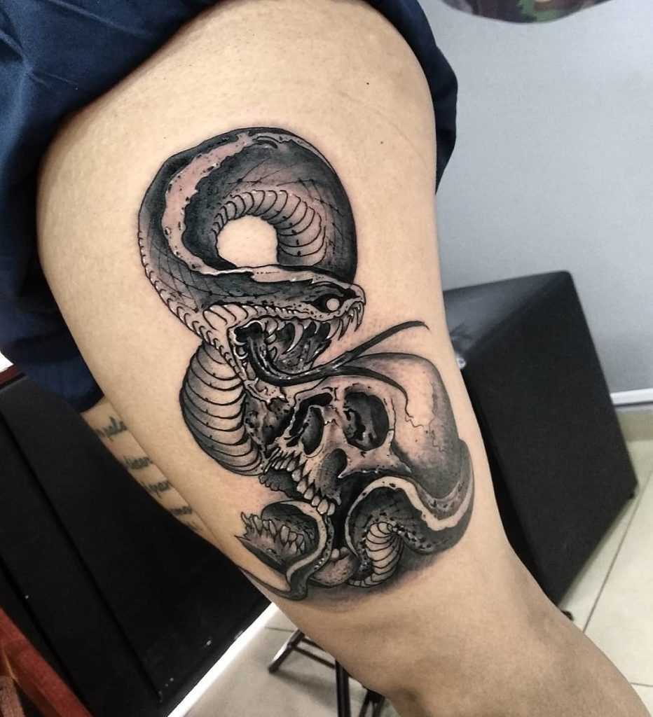 Череп может символизировать не только смерть, но и бессмертие. Если в тату изображают череп со змеей, вылезающей из глазницы, она символизирует бессмертие и мудрость, и говорит о том, что наши знания и опыт остаются на земле после нашей смерти.