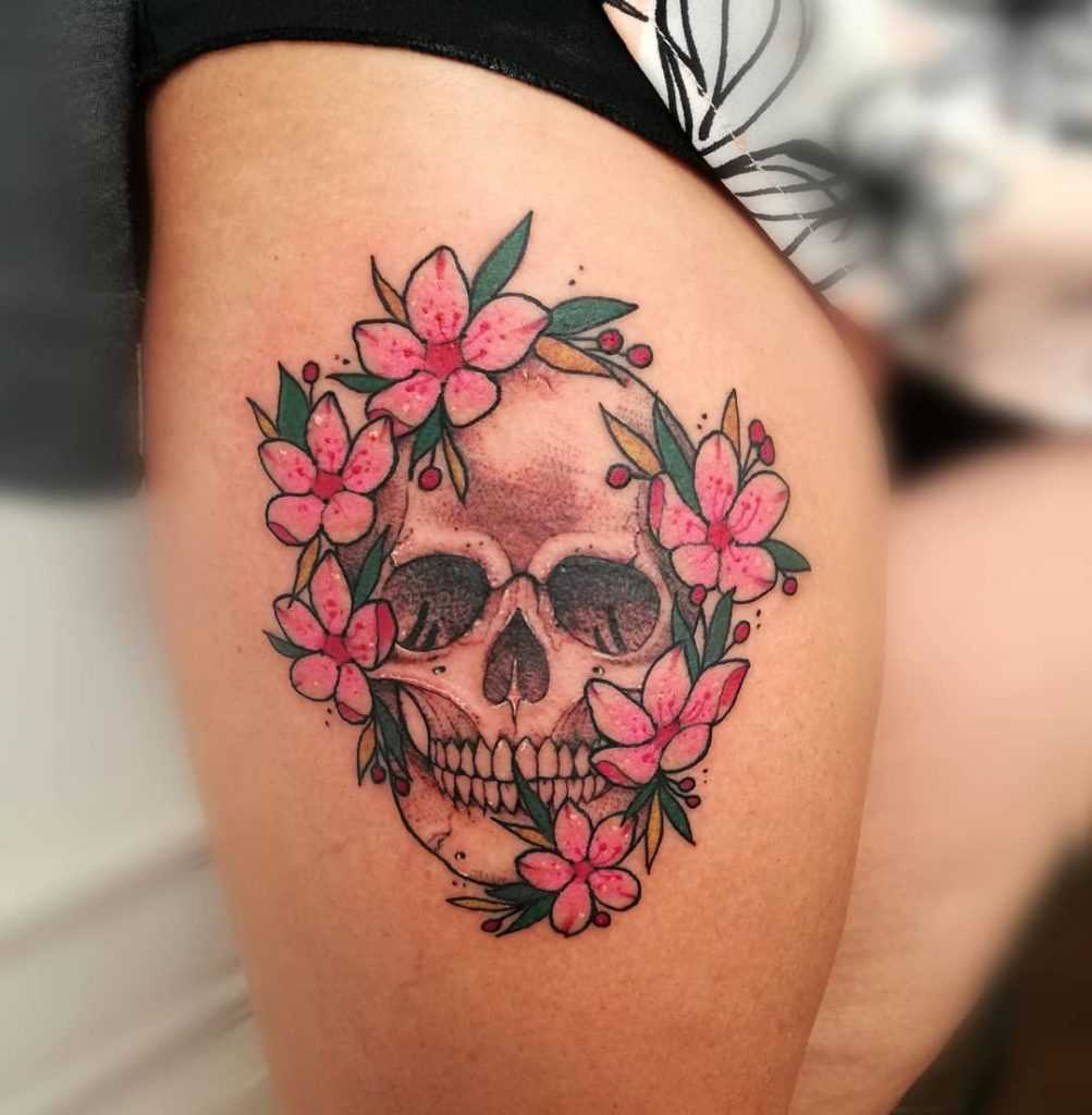 - Череп в цветах. Необычная тема, в которой гармонично соединяются символы жизни и смерти. Означает, что нельзя унывать, надо радоваться жизни и быть счастливой, пока не наступит смерть.