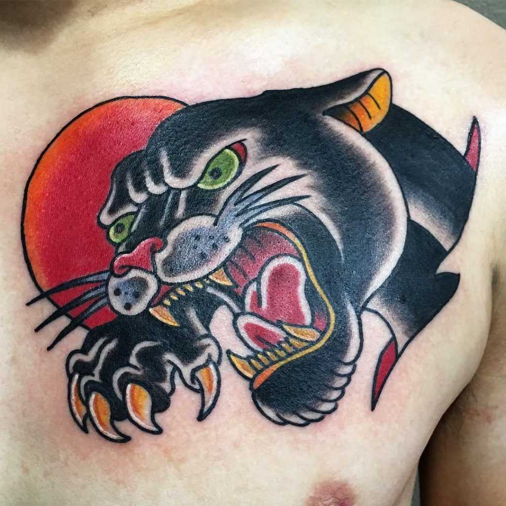 - Оскал пантеры в стиле олд скул символизирует мощь, мужество, несгибаемость. Обладатель подобного рисунка всегда готов к бою. Он отстаивает свои интересы, умеет постоять за себя и свою семью.