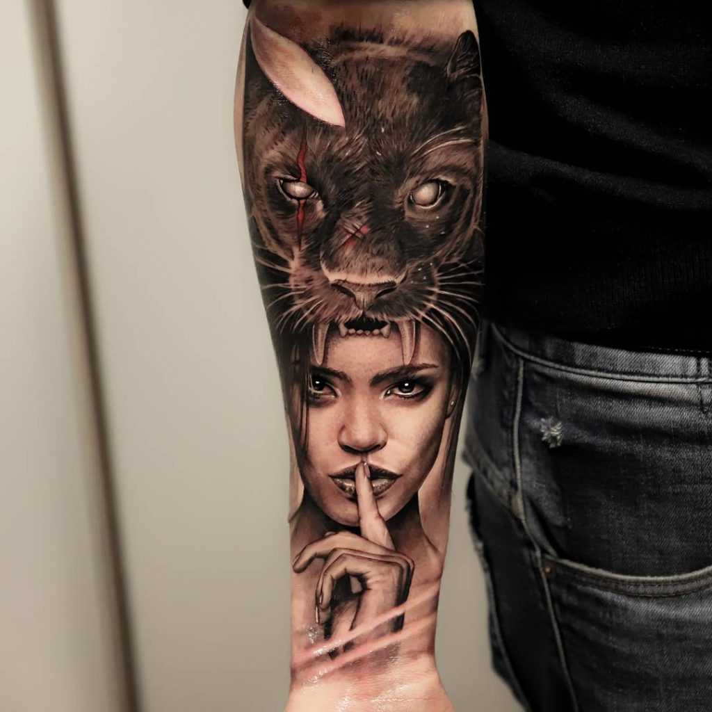 Для вытянутых в длину рисунков (например, прыгающий или ползущий зверь) выбирают предплечья или голени. На руке тату может размещаться отдельно или входить в состав рукава. Последний вариант позволяет совместить центральную картину со множеством мелких изображений.