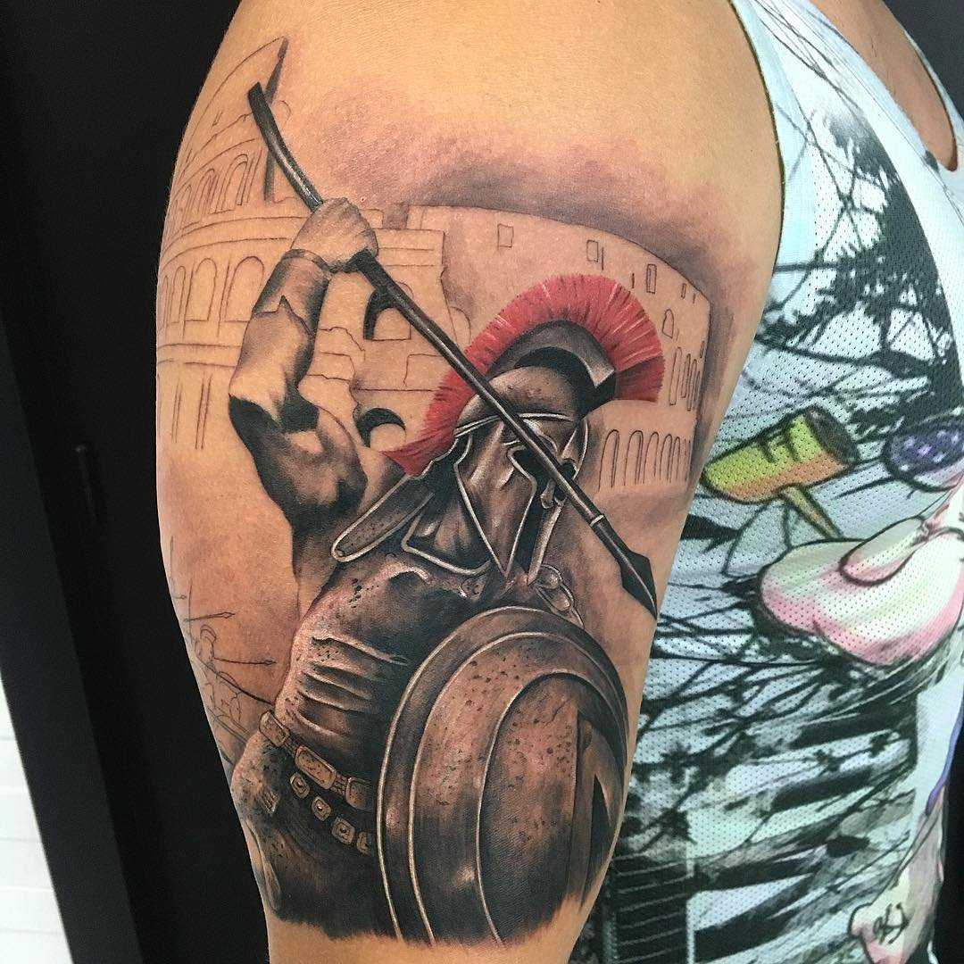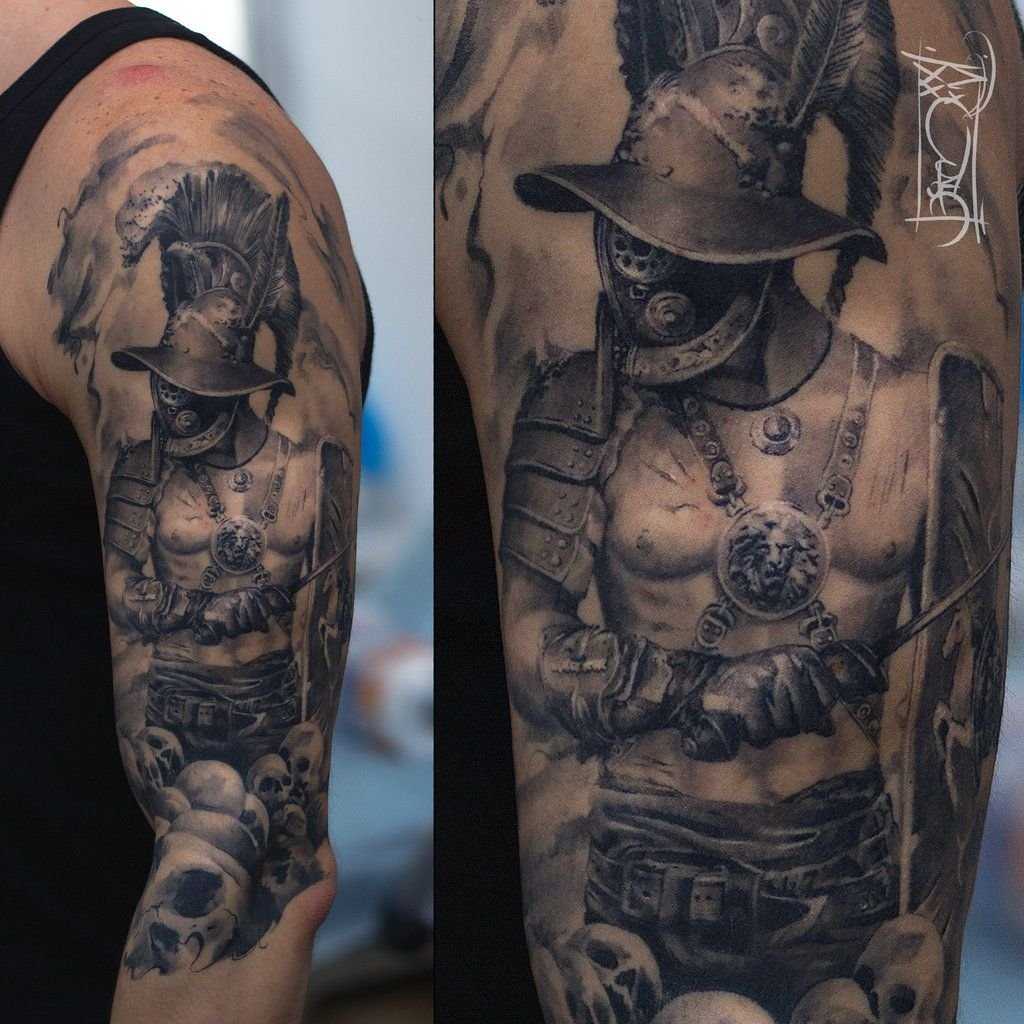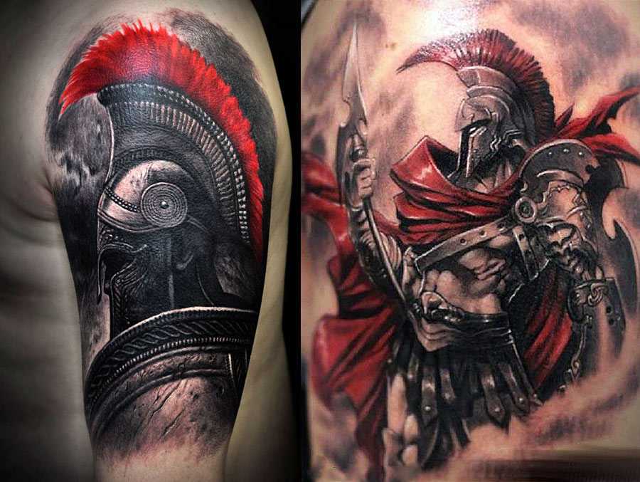 Подобная татуировка отдает дань истории и переносит в эпоху доблестных сражений, отваги и героизма. Чаще всего на татуировках изображают знаменитых гладиаторов Рима и провинций Римской империи, героев Греции и поэмы Гомера «Илиада».