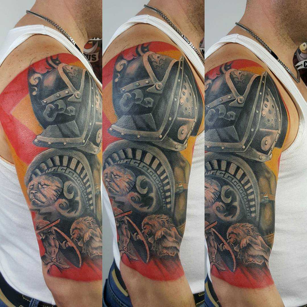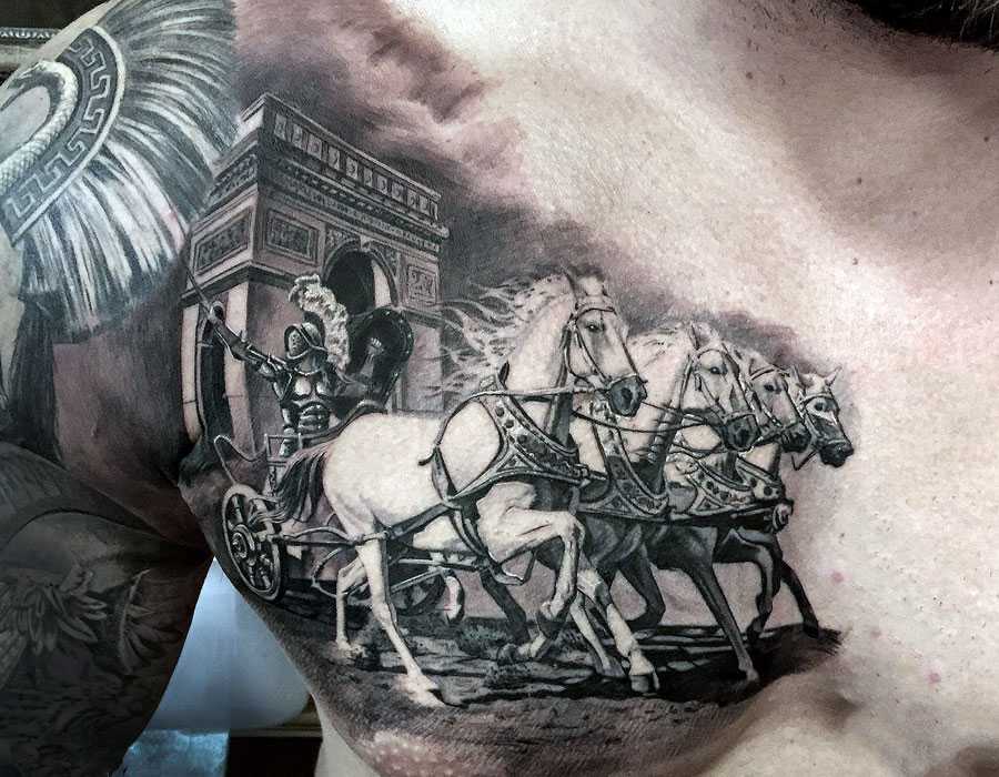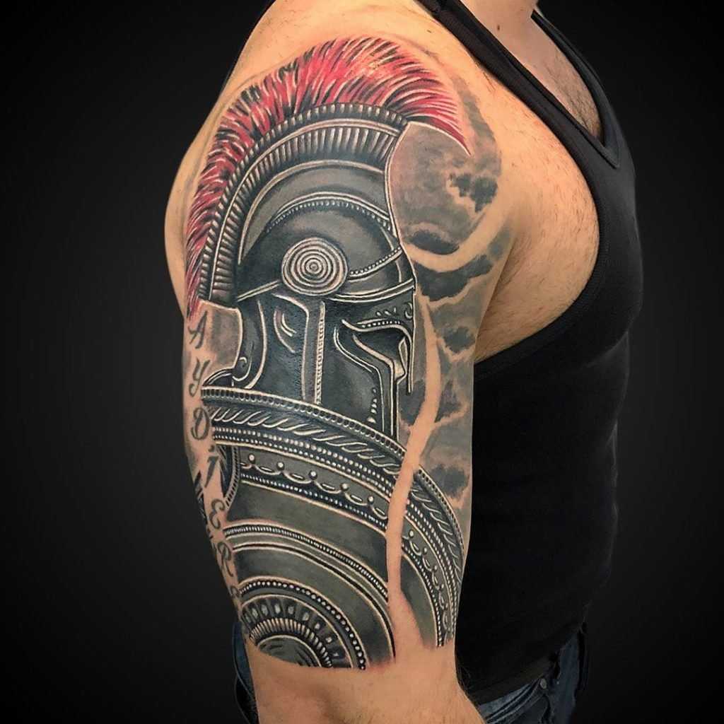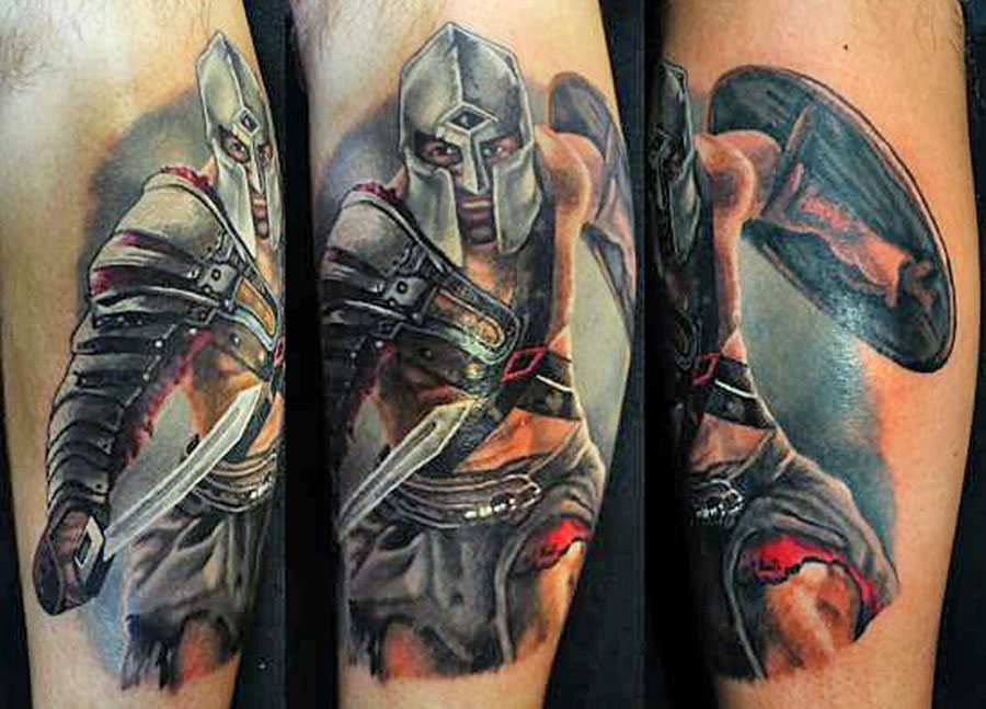 Подобная татуировка отдает дань истории и переносит в эпоху доблестных сражений, отваги и героизма. Чаще всего на татуировках изображают знаменитых гладиаторов Рима и провинций Римской империи, героев Греции и поэмы Гомера «Илиада».