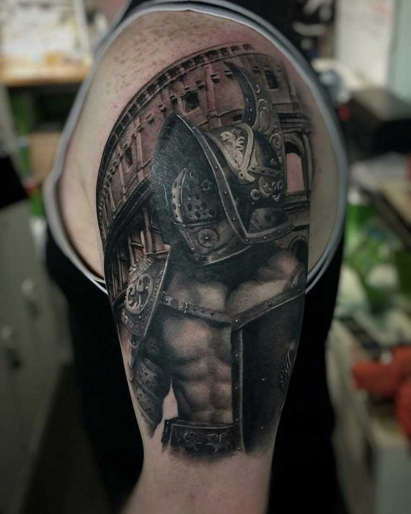 Лучшими местами на теле татуировки гладиатора в полном цвете с тщательной прорисовкой все же остаются спина и плечо.
