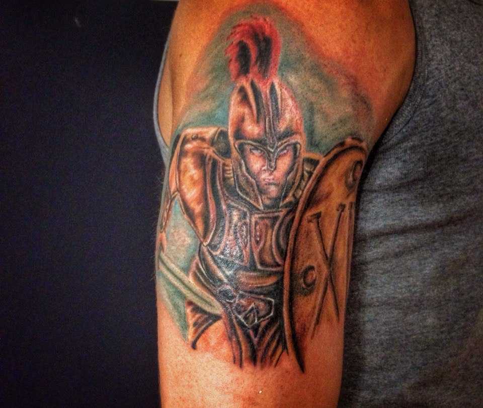 Рисунок гладиатора на плече будет идеально выглядеть в полноцветном исполнении. Важна прорисовка героя, его выражение лица, детализация.