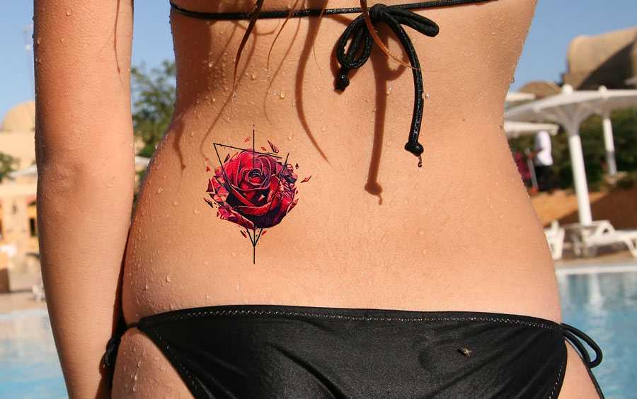 Женская татуировка на пояснице в виде розы в треугольнике линий