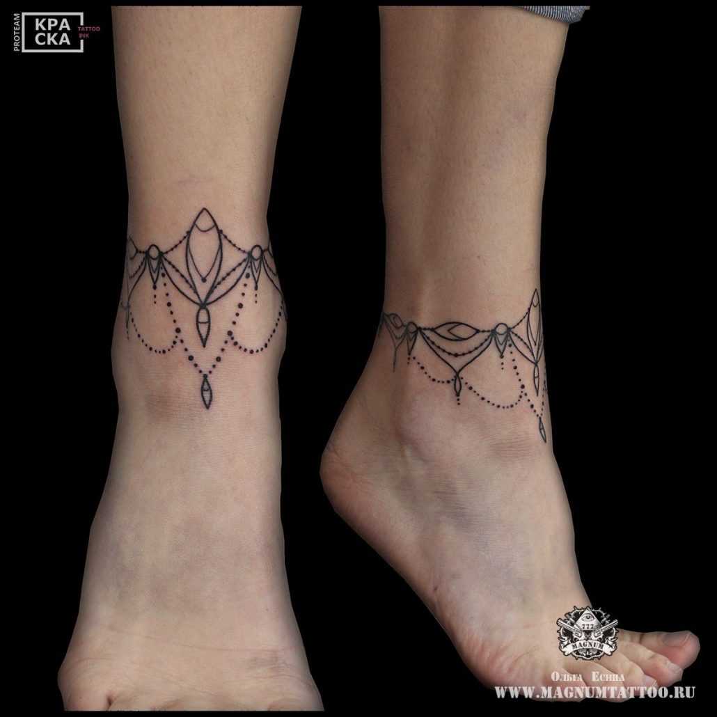 Расположение:На верхней части голеностопна. Считается одним из самых оптимальным вариантом, так как татуировка долго сохраняет яркость, и хорошо держит контур. Интересным вариантом будет парная татуировка (рисунок разбивается на две части и на каждой ступне изображается одна из этих элементов, а при сведении получается полноценный рисунок или одна часть изображается на вашей ноге, а другая на ноге партнера и так же при совмещении получается полноценный образ).