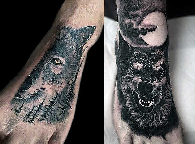 Тату на ступне мужские встречаются не так часто, как женские. Мужчины редко прибегают к процедуре нанесения татуировок на эту часть тела, однако встречаются такие случаи, когда татуировка на ступне является неотъемлемой частью общей композиции. Мужчины предпочитают изображения животных около ступни (волки, львы, медведи), природы (лес, деревья, водопады), космических элементов (планеты, космос и др). Среди представителей сильного пола также популярны различные надписи, в основном, мотивирующие