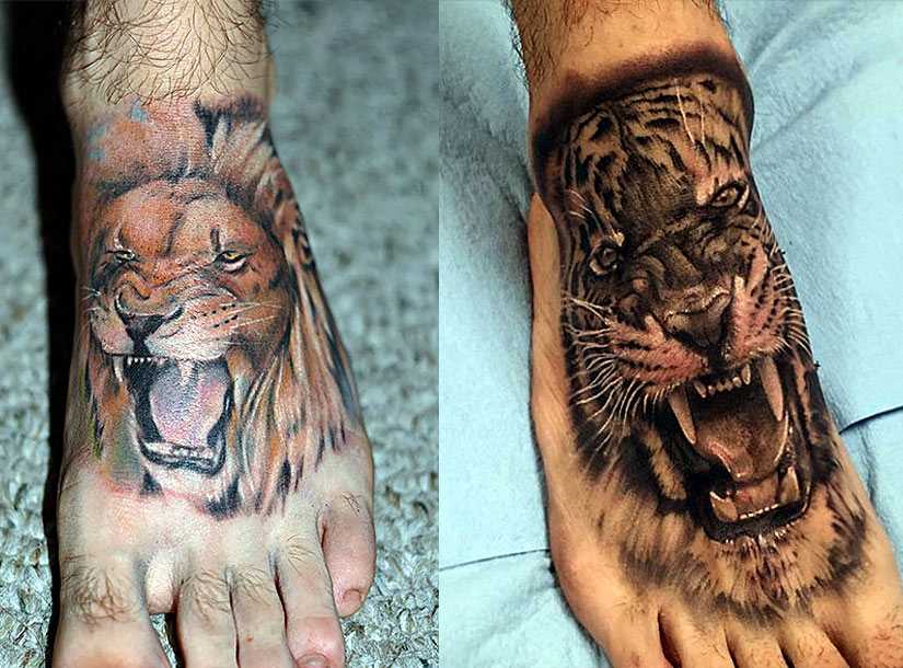Изящная мордочка кошки на внешней поверхности стопы привлекает своей красотой, предупреждая о коварстве и хитрости хозяйки тату. Гибкое тело змеи, обвивающей щиколотку, проявляет рассудительную натуру, готовую к искушениям и опасностям. Оттиск небольшой ящерицы возле пятки символизирует мудрость и удачу, а плотно охвативший палец ноги скорпион станет оберегом благородной, но одинокой носительницы.