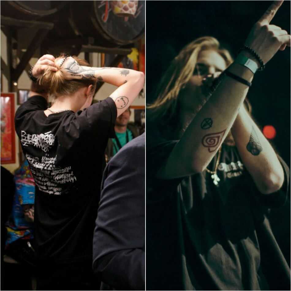 Также, на правом предплечье надпись «слишком редкий» и небольшой орнамент.