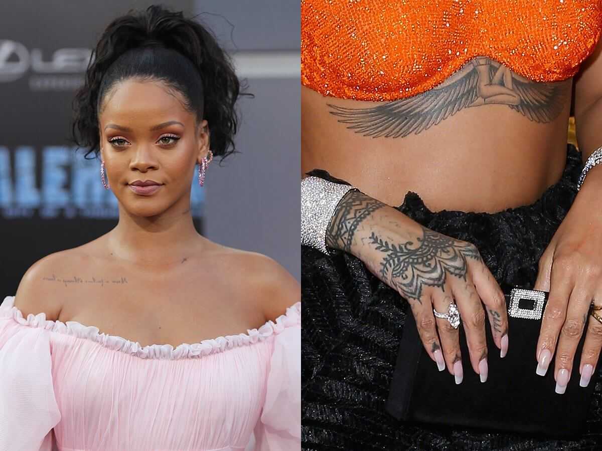 Рианна вытатуировала египетскую богиню Исиду под грудью в честь своей покойной бабушки. Кроме того, у татуированной певицы мехенди на руке, звезды на спине, акула на щиколотке и надпись на ключице.