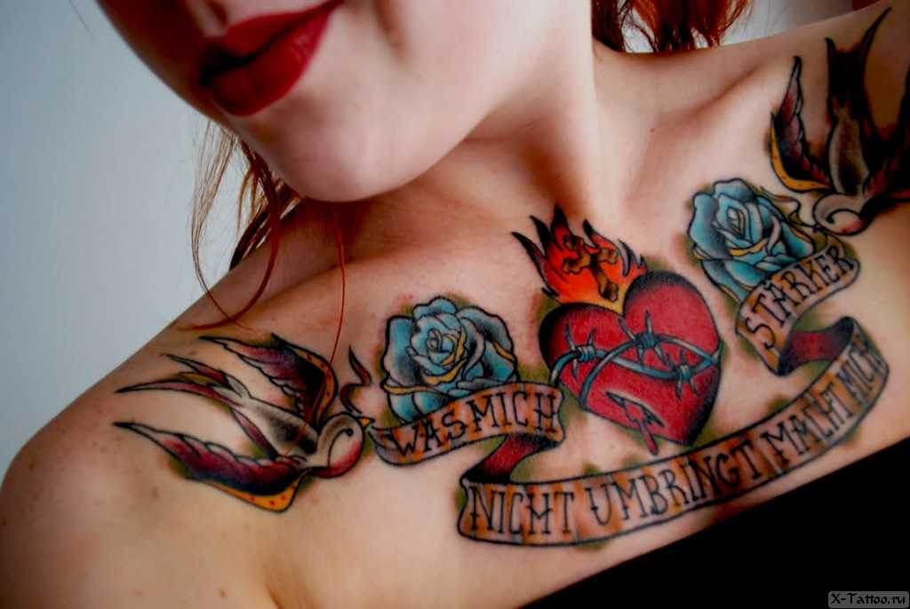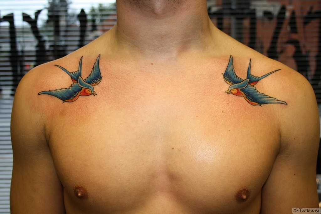 Очень популярны небольшие татуировки в виде ласточки. Их часто изображают в зеркальном виде с двух сторон на шее, плечах, предплечьях и ступнях. Ласточка порхающий знак счастья и удачи, чего так всегда катастрофически не хватает.
