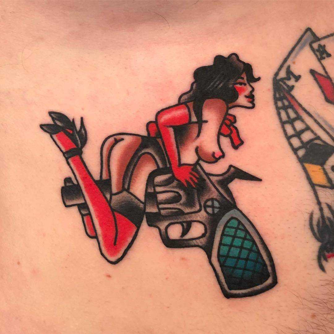 Изображение пистолета издавна является неоднозначным. На первый взгляд пистолет считается опасным огнестрельным оружием, но татуировку с изображением пистолета часто выбирают для себя представительницы нежного пола. Пистолет, который заправлен за смелую и красивую подвязку, расскажет об игривом и веселом нраве. Но все-таки татуировка с изображением пистолета на теле девушки, даже с различными дополнениями в виде цветов, лент и узоров, расскажет о том, что обладательница такой татуировки буде мила не всегда, при необходимости она легко сможет за себя постоять.