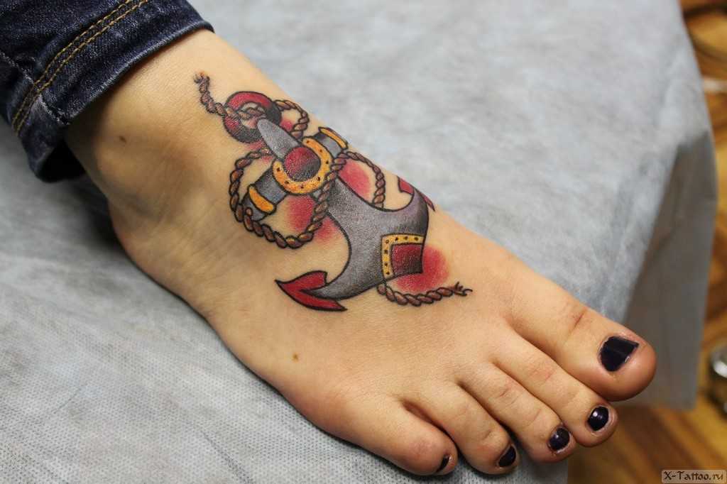 Главное место в Олд скул тату занимают якоря и морские снасти. В этом символе сочетается религиозный подтекст и сила духа. По своей форме якорь напоминает крест, что указывает на веру, а сталь, из которой он изготовлен, на крепкий характер.