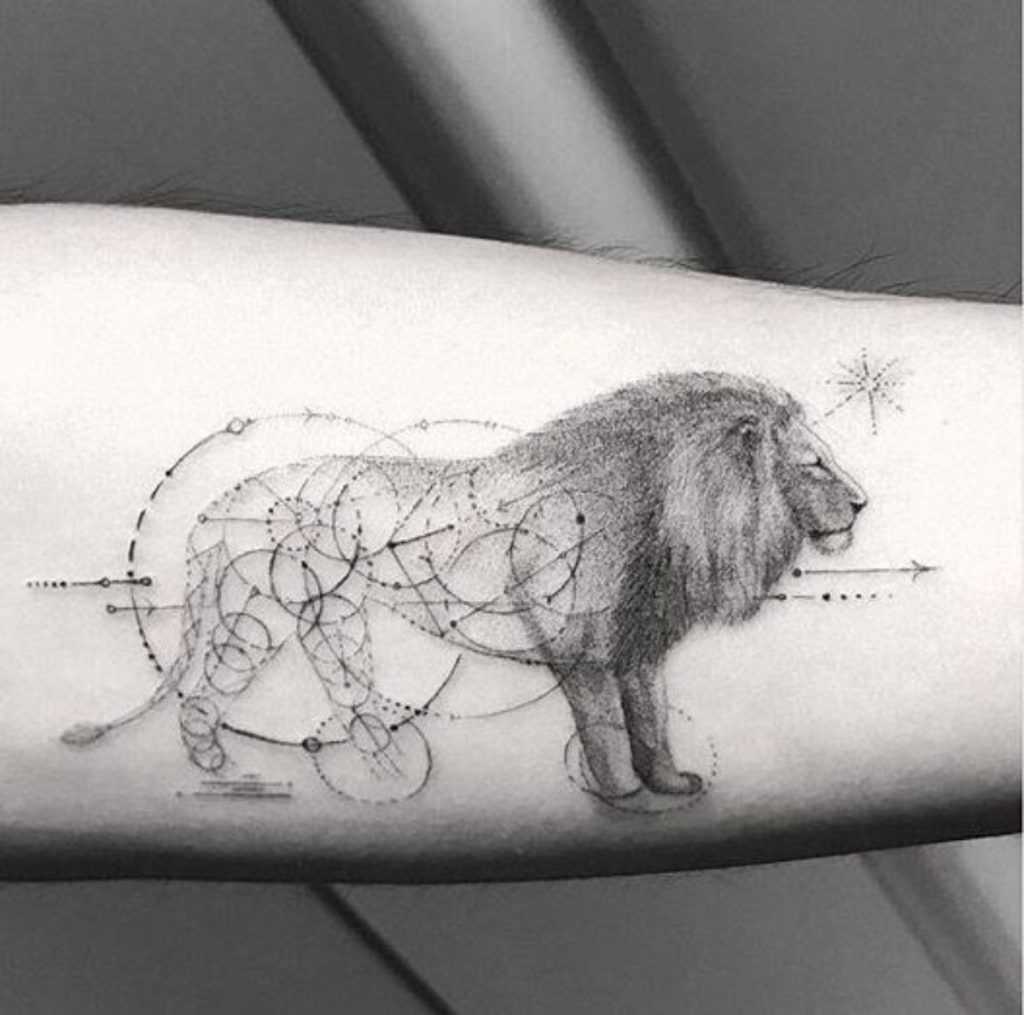 Смотрятся они более сдержанными, чем любое другое изображение, даже иногда абстрактно, это и придает шарма такой наколке. Геометрический лев одинаково подходит людям обоих половых принадлежностей. Наиболее часто их накалывают на: голень или предплечье.
