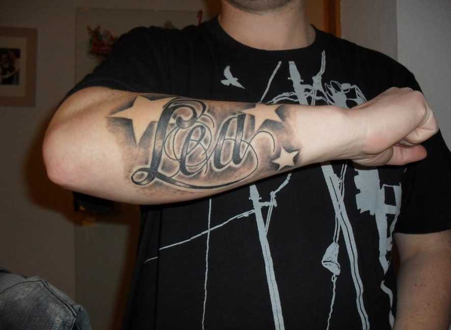 Если мужчина носит имя Лев, то наколка с одноименным животным сама по себе просится на тело. Можно использовать, как сам силуэт животного, так и просто прорисованное шрифтом имя.