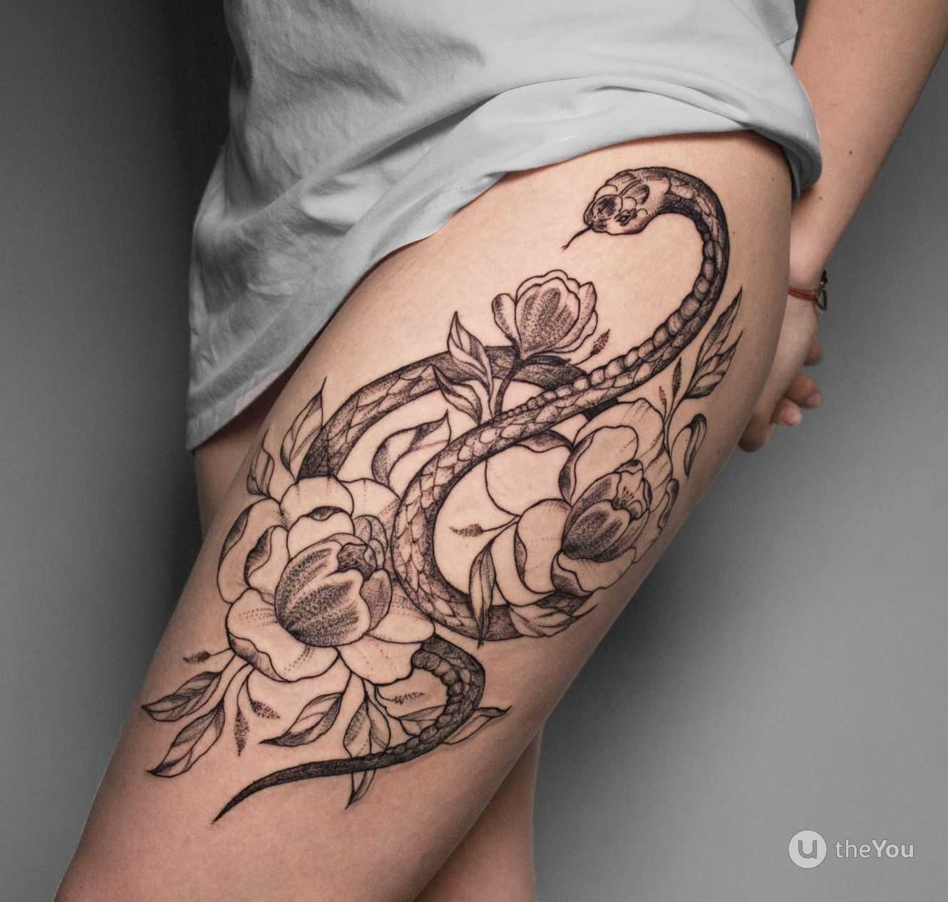 Образ змеи покоряет изящной красотой, многогранным символизмом. Благодаря способности извиваться змея впишется в любую композицию на ноге или одиночно ляжет на выбранный участок. Чаще татуировку змеи выполняют в монохромном варианте.