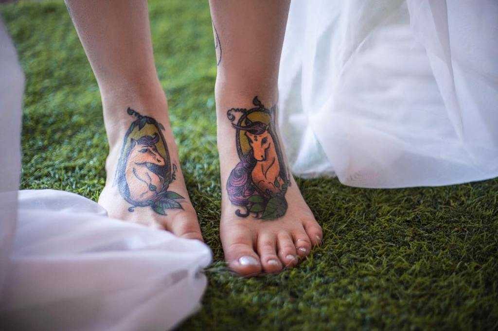 - тату на стопе может требовать частой коррекции, поскольку постоянно взаимодействует с обувью. Наиболее подвержена деформации тату надпись: со временем она может потерять цвет или слиться в нечитаемое пятно;