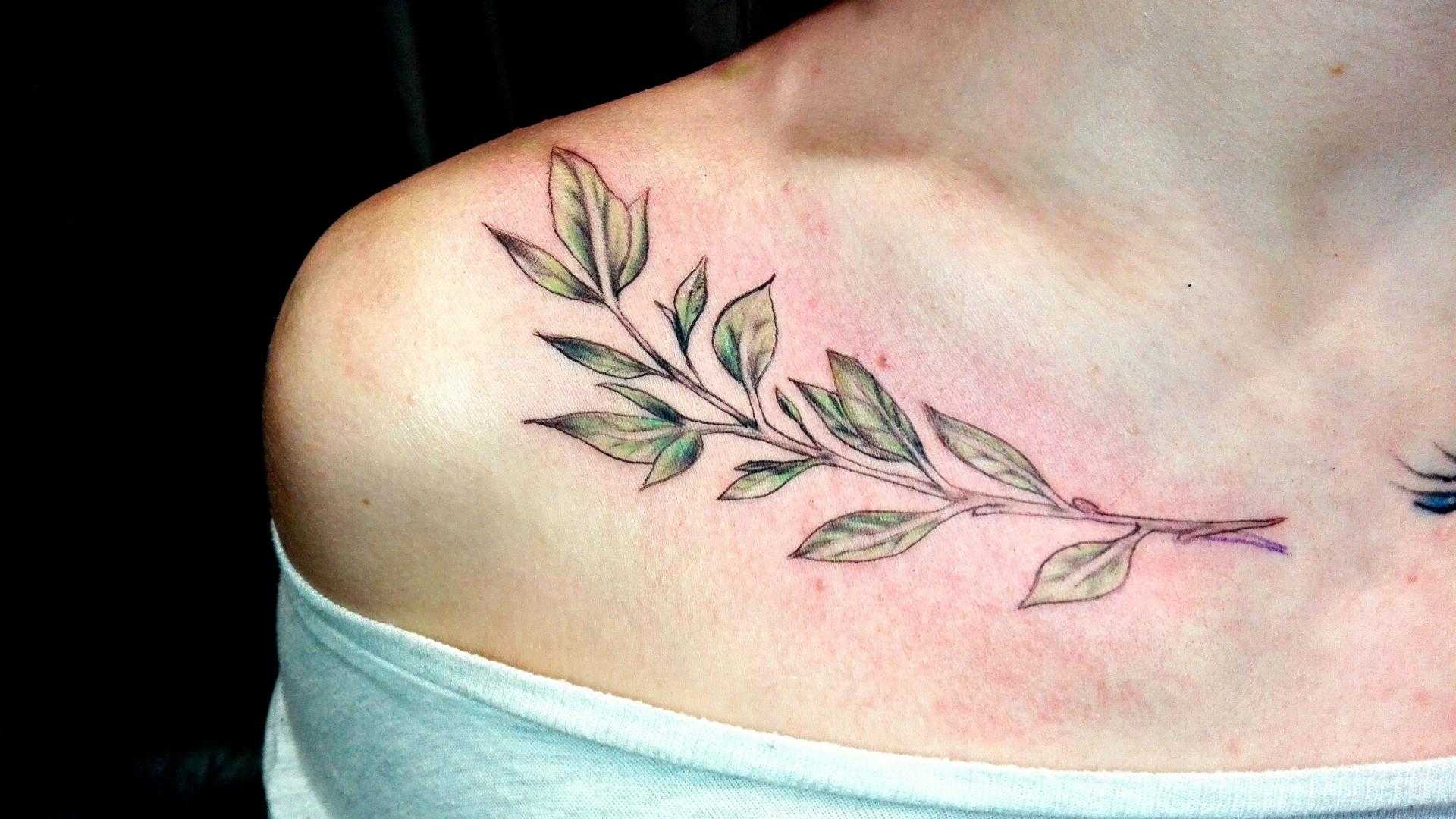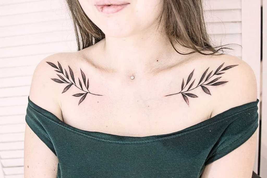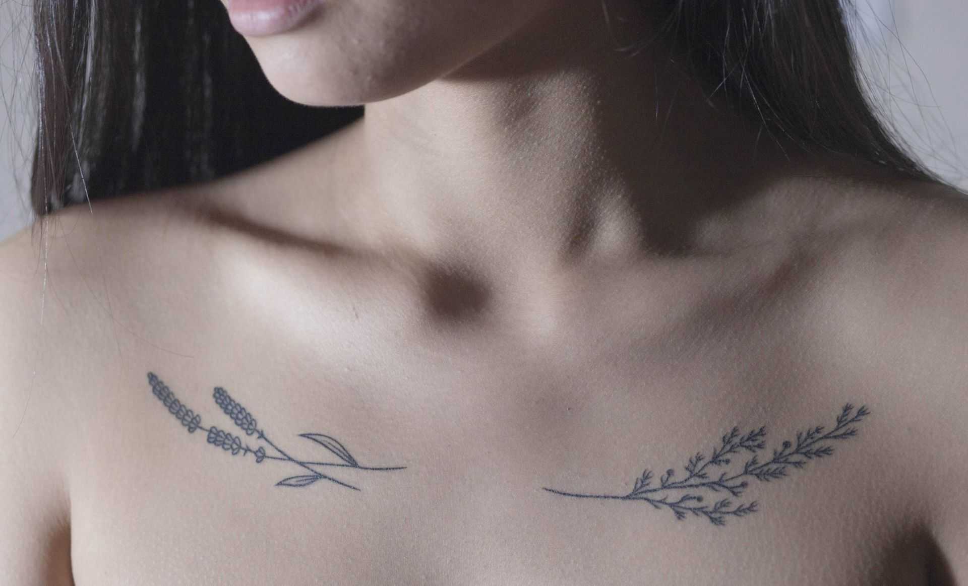 Тонкая веточка на ключице обратит внимание на изгиб шеи, хрупкую ключичную кость, подчеркивая изящество фигуры. На ключице рисуют сирень, лаванду, цветущую сакуру и другие нежные веточки растений