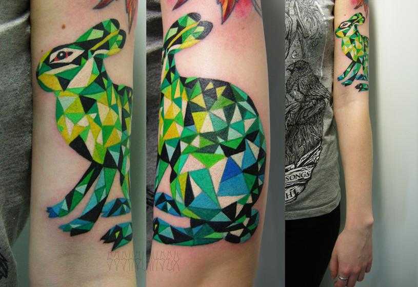 Стилизованный заяц пользуется большой популярностью среди девушек. Творческие натуры проявляют фантазию и накалывают зайца, состоящего из квадратов, ромбов или кружков. Также заячью форму могут создавать причудливо изогнутые линии или отдельно стоящие цветовые пятна.