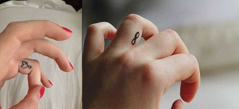 Иногда тату наносят на безымянный палец левой руки. Именно на нём в будущем предстоит носить обручальное кольцо. В этом плане татуировка в виде бесконечности для девушки – своеобразная приманка для любви.