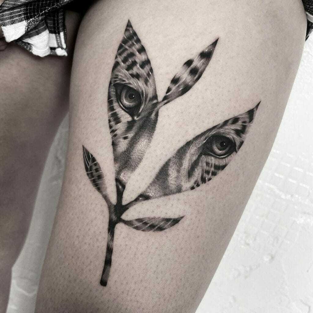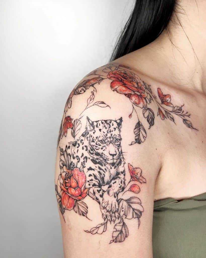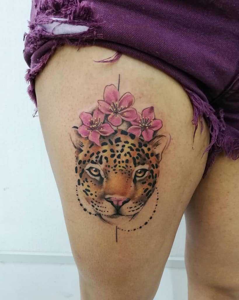 We are confident that if you choose this tattoo, you will have a unique piece of art designed on your body forever. Using the concept of double exposure in tattoos is a rare feat, and this jaguar tattoo manages to do that and how! For a piece emanating beauty, try using another animal of the cat family, such as a leopard, for the final tattoo design.
