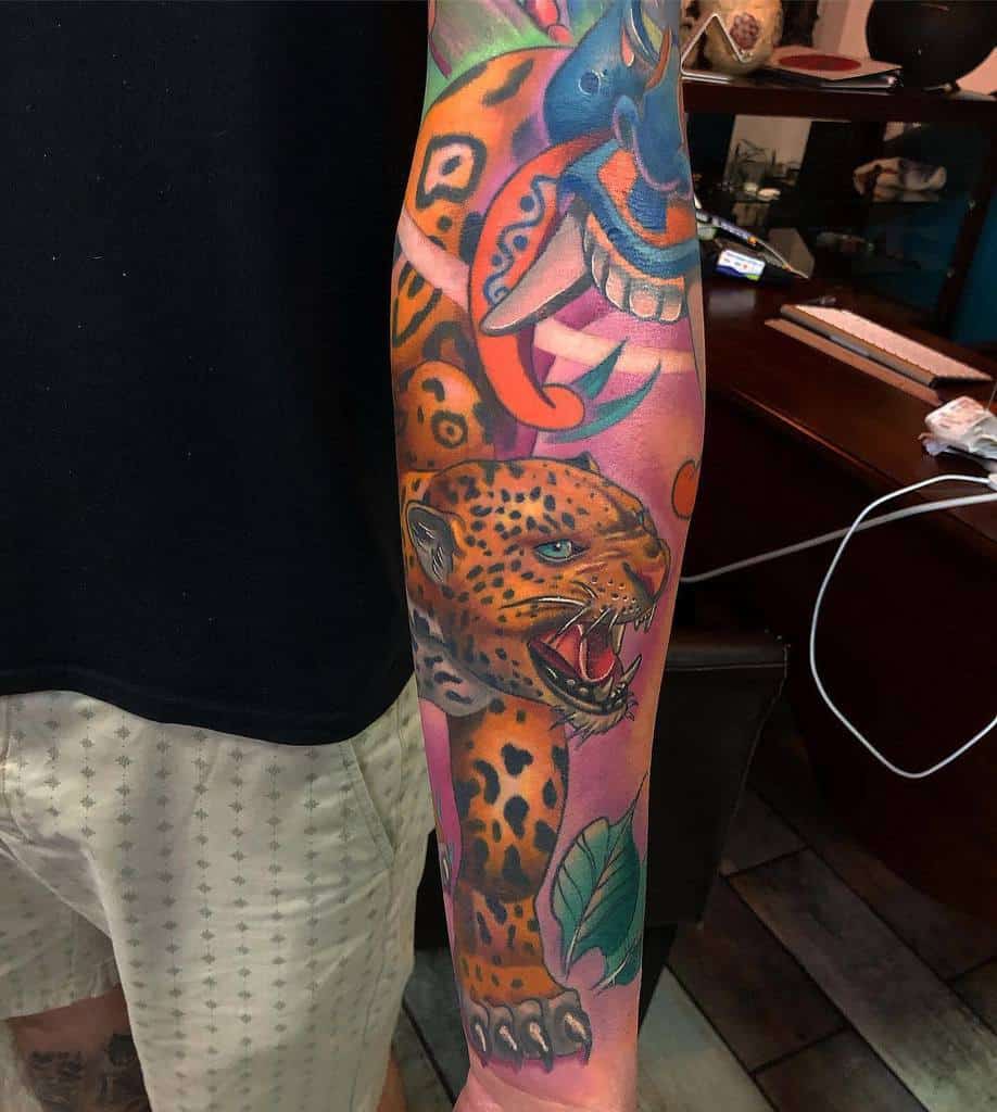 For some people there simply is no other way to fully capture their personality and exuberance than with bright colors. While we have seen that jaguars can be successfully applied in a number of different styles and approaches, these big cats can make for some incredible full color tattoos.