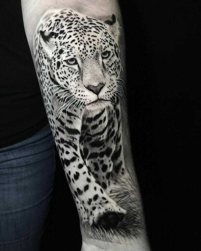 Ягуар в тату-работах выполняется как в полный рост, так и лишь голова хищника. Это может быть спокойное животное, с оскалом или в прыжке. Выбирая место для нанесения хищника, стоит выбирать более масштабные участки: спина, грудь, предплечье, плече, верхняя часть ноги.