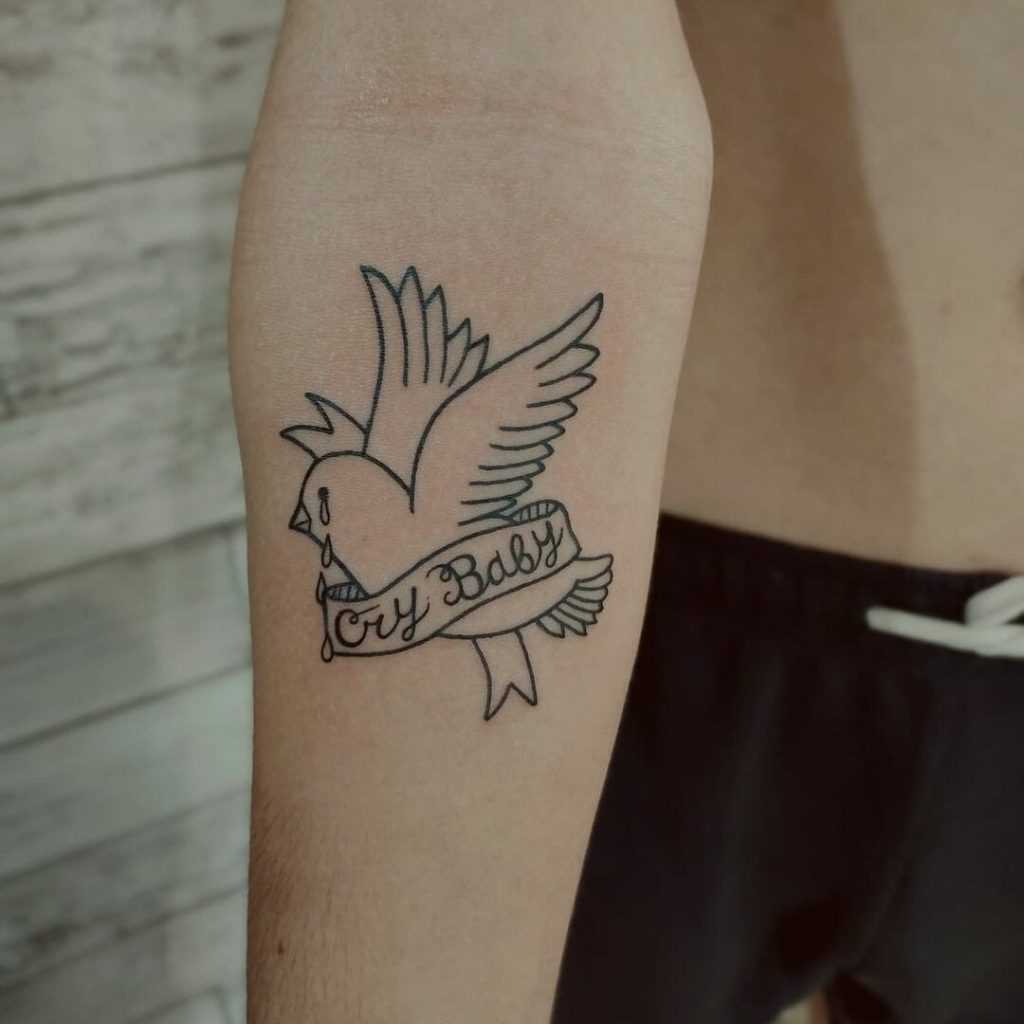 One of the most famous crybaby Tattoos is on the forehead of American rapper Lil Peep. He said he got the design because he used to cry a lot as a child. The tattoo is a representation of his childhood cries. The singer also said he got the tattoo because he grew up complaining a lot.
