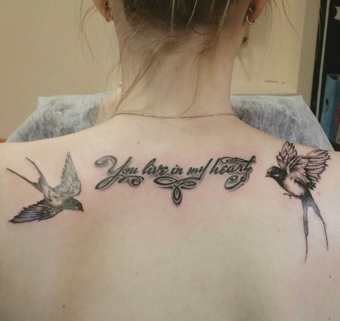 Тату птичек с надписью. Еще одним распространенным и удивительным дизайном является изображение двух ласточек, которые связаны друг с другом надписью. Это идеальный вариант для размещения на плечах. Одна птичка на правом плече, вторая на левом, а между ними – какая-нибудь важная для человека фраза.
