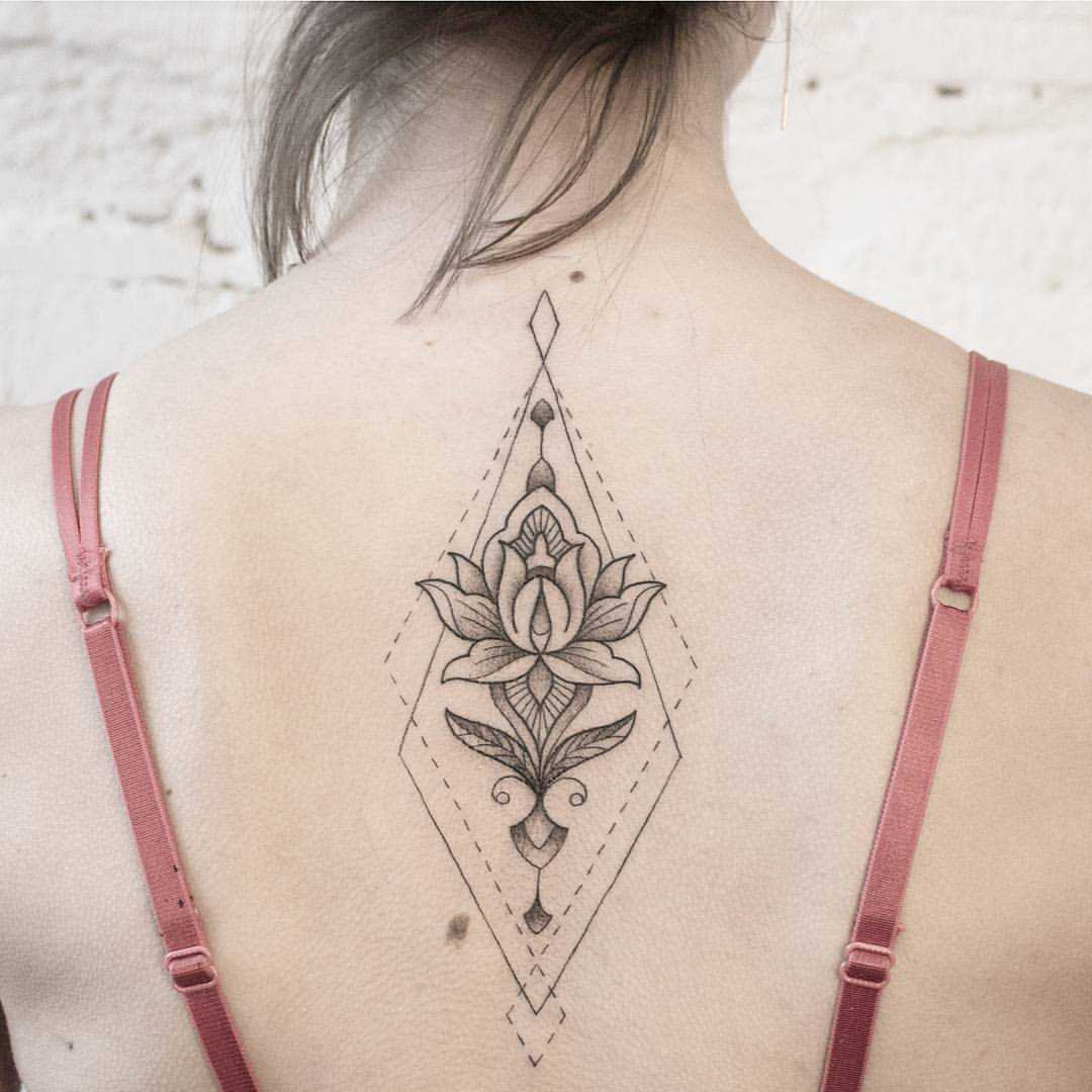 - Спина – в этом случае лотос располагается по центру между лопатками или на одной из них. При этом лотос должен иметь вид уже распустившегося цветка.