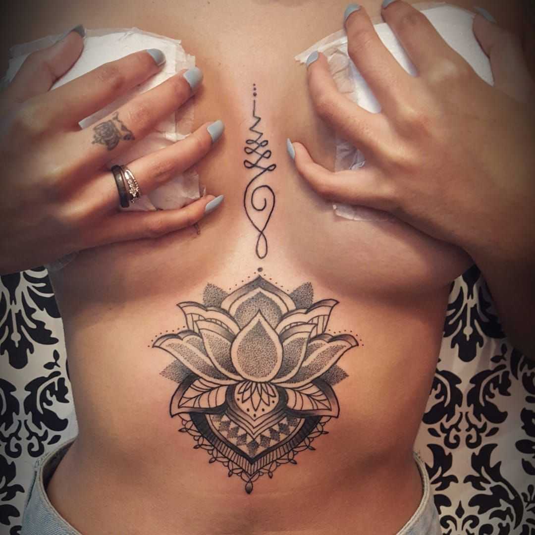 - Тату с лотосом под грудью – вариант для экстравагантных девушек, которые увлечены восточной культурой и стремятся к духовному развитию и просветлению. Рисунок обладает особой магической энергией благодаря тому, что он скрыт от посторонних глаз.