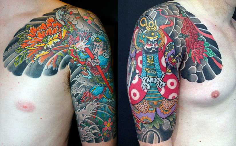 Молодым людям нравятся варианты, выполненные в традиционном японском «самурайском» стиле. Она практически всегда многоцветная, состоящая из множества больших и маленьких элементов – цветов, листьев, различных предметов.