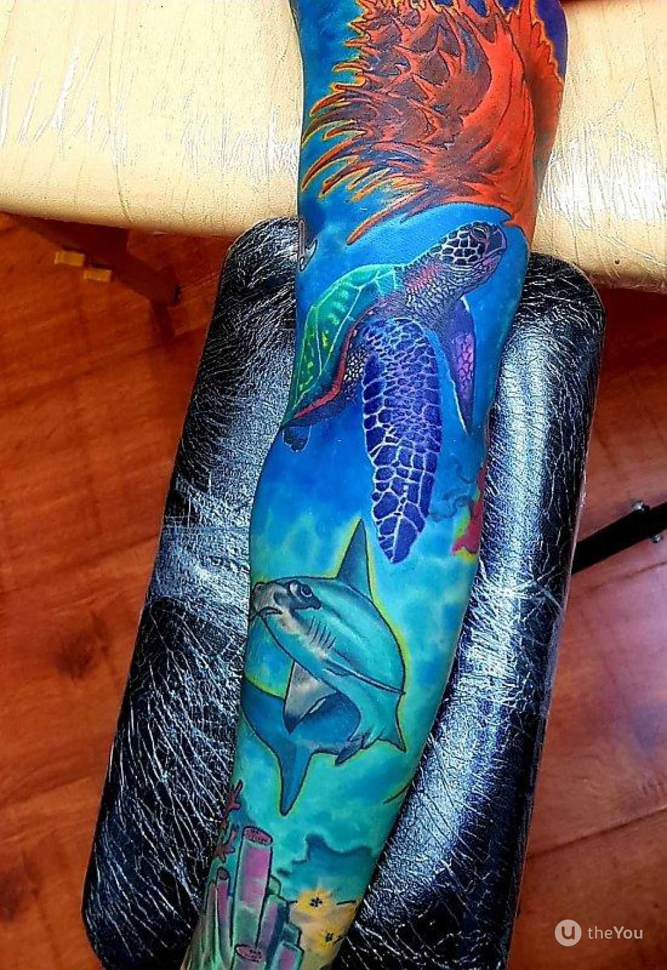 От стиля тату рукав зависит и их эстетический смысл. Существует десятки жанров выполнения красивых татуировок в цвете для мужчин и женщин по всей руке. Главный прием цветного тату треш полька является провокация. На изображениях такого вида чаще всего вы увидите иронию, сарказм, и даже нецензурную лексику. Треш полька соединяет в себе красивый вид рисунка и мучительный вид смерти и ужаса. Более интересно смотрится крупный рисунок, ведь в нем можно выразить свой уникальный смысл татуировки. Стиль реализм считается самым сложным в выполнении в цветном тату в виде рукава, но востребованным и модным. Изображение на руке данного вида подразумевает масштабное исполнение рисунка, чаще всего производит сочетание портретов, часть природы или архитектуры либо мотив из мира фантастики. Рисунки на теле в стиле олд скул берут преимущество яркостью цветов и точностью линий, благодаря чему получаются максимально четкими и объемными. Часто встречаются изображения лиц, русалок, кораблей, роз ветра, иногда это — бабочки и животные с агрессивным характером, такие как тигр, ягуар.