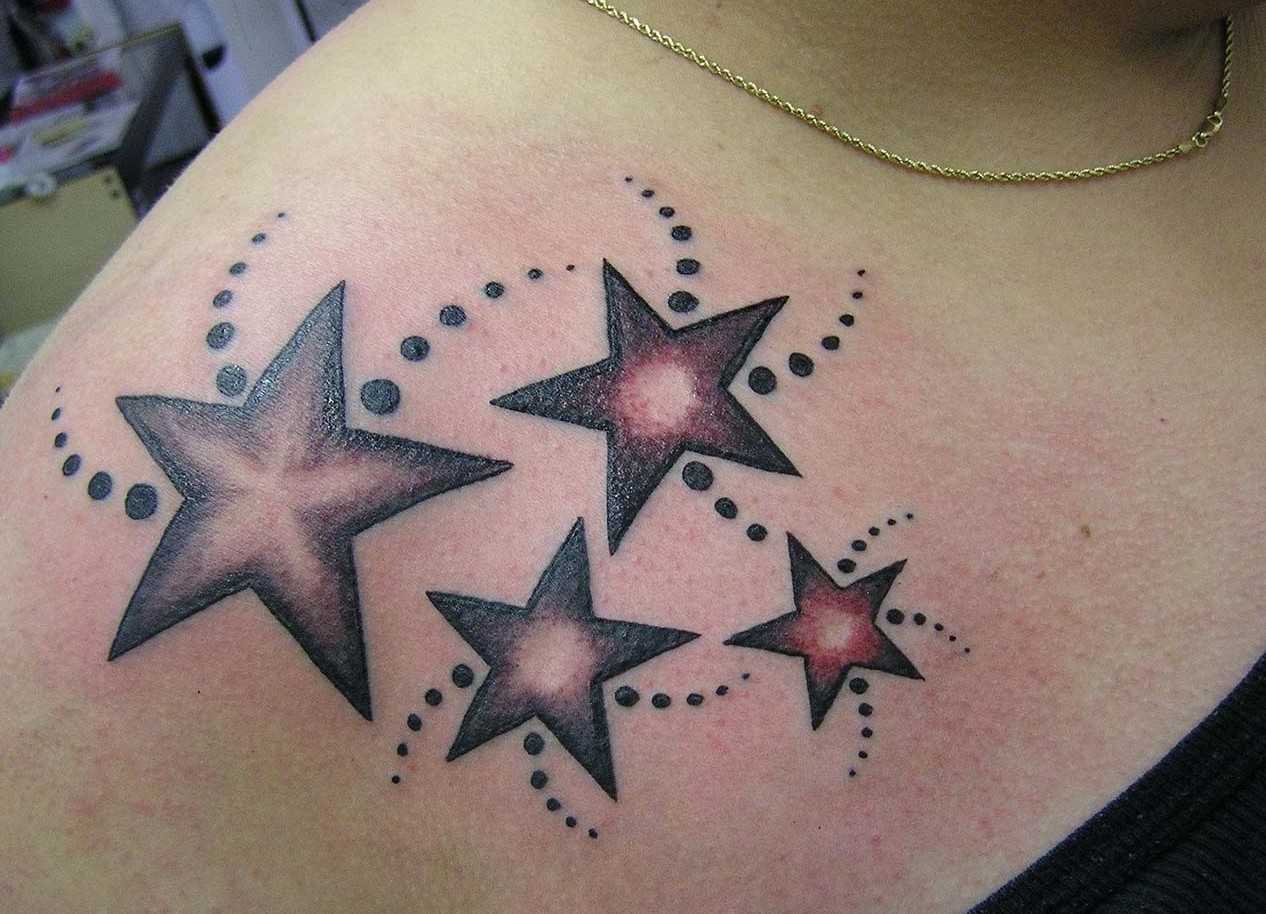 Девушки обожают тату звезда, используя ее изображение практически по всему телу. Если мужчины изображают на своем теле лишь одну звезду, то представительницы прекрасного пола предпочитают их россыпь на плечах, ступнях или животе. Количество звезд на плечах указывает на число близких и любимых людей. Шестиконечная звезда на плечах девушки – объединение 6 факторов: мир, истина, любовь и гармония, красота и доверие. Особое значение несет Вифлеемская звезда, символизирующая удачу.