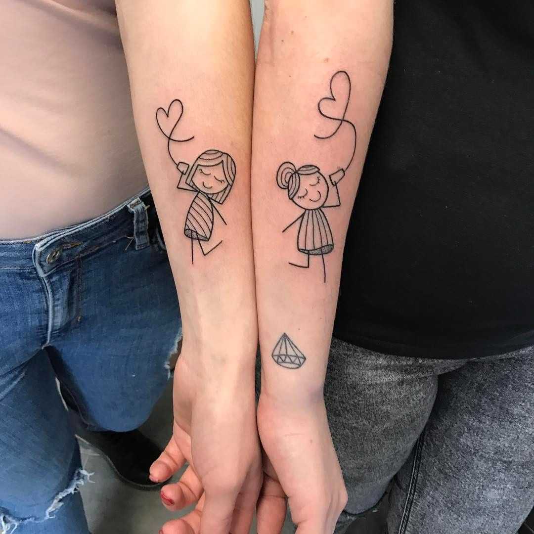 По мере того, как у подружек появляется желание увековечить свои отношения при помощи тату, одновременно с этим возникает вопрос, где именно расположить рисунок. Одной из наиболее популярных областей в этом варианте является рука, а именно плечо, предплечье, запястье или пальцы. Удачным решением для подобного решения станут цветные или однотонные татуировки небольшого размера либо различные узоры в виде браслетов. Среди актуальных предложений всевозможные надписи, рисунки с животными, персонажи мультфильмов, портретные изображения кумиров, цифры и различные знаки, короны, сердца, геометрические композиции, флористика и многие другие идеи. Такие татуировки, как правило, отличаются небольшими размерами, особенно если нанесение рисунка планируется на пальцах или запястье. Что касается выбора техники, то среди актуальных предложений можно выделить яркую и красочную акварель, оригинальный минимализм, строгую графику, геометрию, литтеринг и многие другие вариации, которые будут одобрены на общем собрании подруг и идеально подойдут к характеру каждой дамы.