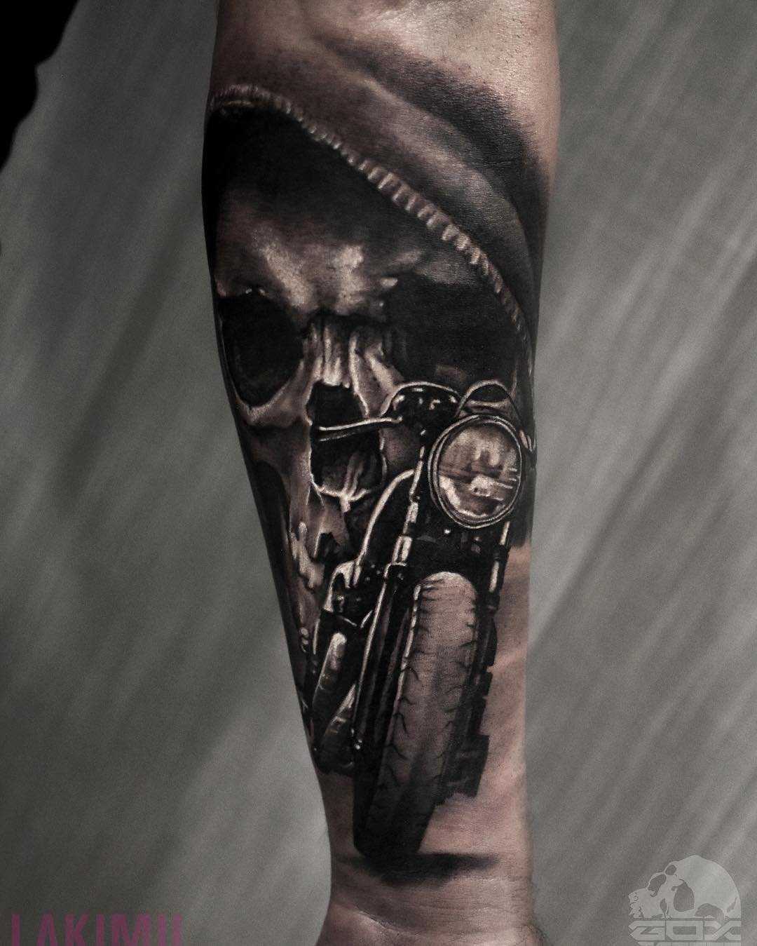 Если байк нарисован в окружении огня, такая татуировка мотоцикла на руке может говорить о горячем характере своего обладателя. Изображение железного коня и гордого орла, как правило, указывает на свободолюбие человека. Тату спидометра мотоцикла расскажет о жажде скорости. Большое значение для байкеров играют тату на тему смерти. Картинкой мотоцикла и черепа на своем теле они хотят показать, что не боятся костлявой и всячески уважают ее. Очень эффектно смотрится тату девушки на мотоцикле. Особенно часто ею украшают свое тело закоренелые холостяки.