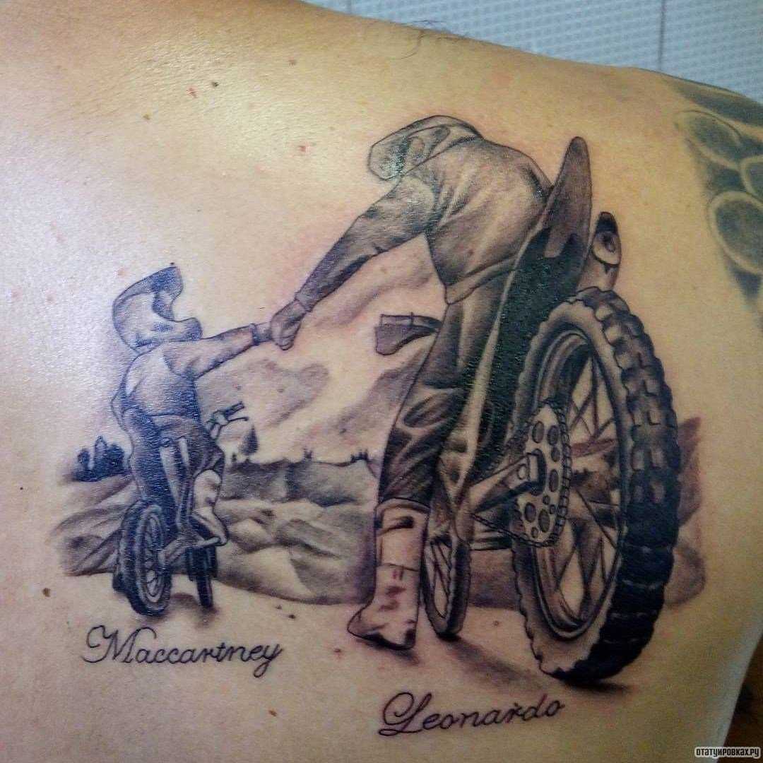 Мужчины чаще всего выбирают цветные или чёрно-белые татуировки с мотоциклом, выполненные в реалистической манере. Тщательно прорисованные детали конструкции нередко копируют любимое транспортное средство, которым владелец очень дорожит. В сюжеты подобных тату включают изображения машин той фирмы, что покорила сердце обладателя навсегда. Такая татуировка сразу выдаст любителей «Харлей Дэвидсона», «Ямахи», «Сузуки» или «Хонды».