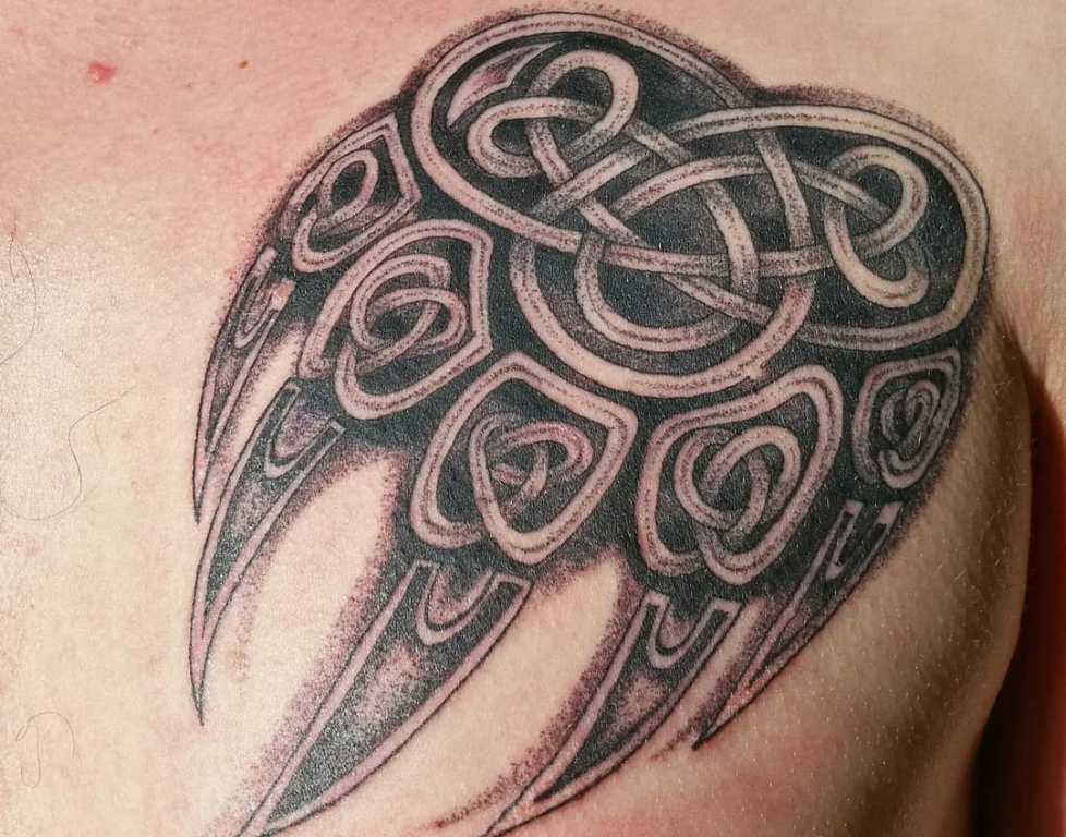 Тату со сложной композицией могут занимать много места – наиболее масштабные лучше изображать на спине. Кельтские орнаменты или узоры в «зверином стиле» эффектно смотрятся на руке или плечевом поясе. На груди удачно выглядит парный сюжет, например в виде 2 солярных знаков.