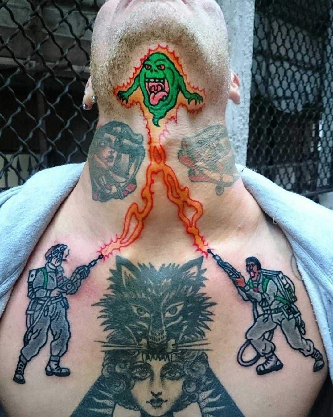 Татуировки веселого характера очень часто встречаются у мужского пола в виде шуточных надписей, сказочных героев. Нередко попадаются изображения, выполненные в технике нью-скул. Например, неординарно и забавно смотрится чек из Макдональдса с подробным описанием товара, или же изображение подтяжек на груди. На голове с залысиной смешно выглядит коза, которая якобы щипает волосы и потихоньку из съедает. Либо человек с газонокосилкой, состригающий волосы. А рука Брюса Ли, переходящая в кулак своего обладателя просто не может оставить равнодушными окружающих. Посудите сами, как же здесь не улыбнуться.