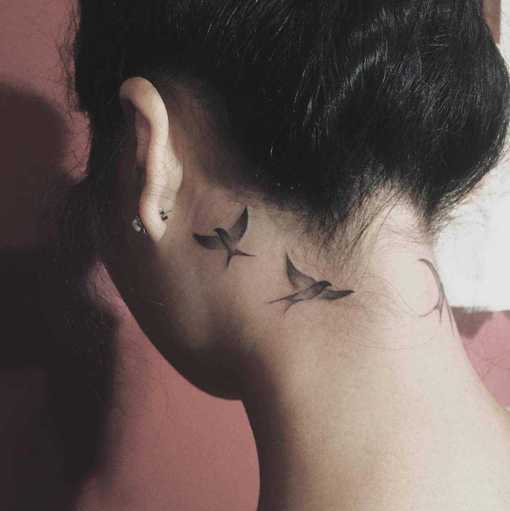 - птицы. Здорово смотрятся объемные эскизы хищных птиц, заполняющие собой область за ушной раковиной, на затылке, распространяющиеся на шею, верх спины. Орел, ворон, сова, ястреб идеально подойдут для подобной татуировки;