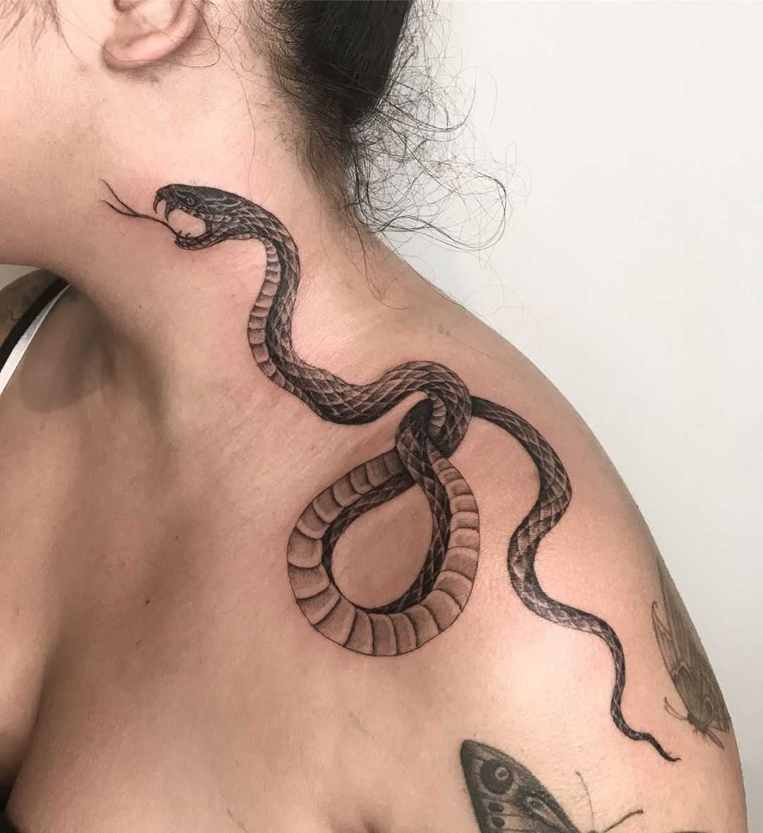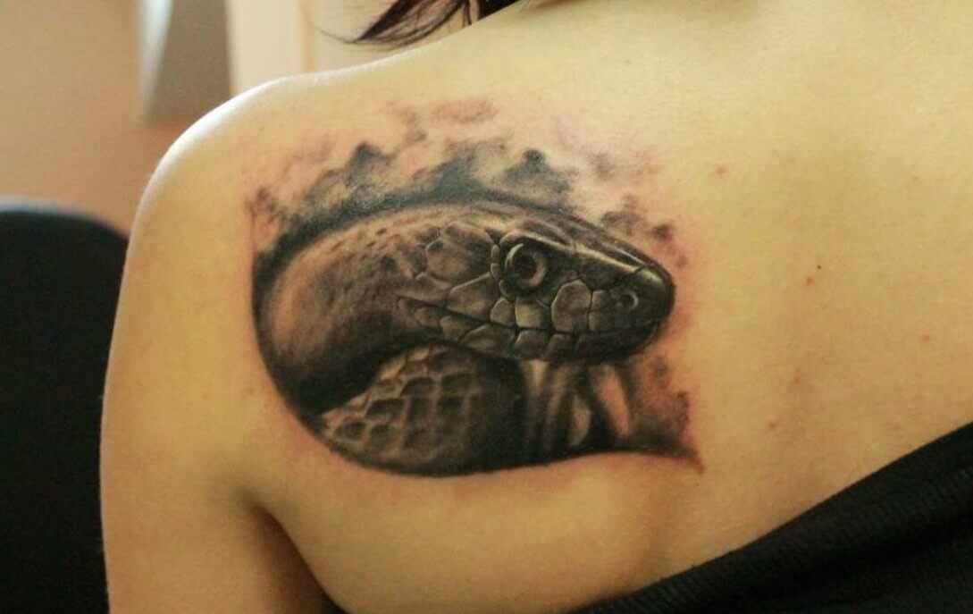 Впечатляюще смотрится татуировка пресмыкающегося на плече, груди, предплечье, когда змеиная голова прорывается сквозь кожу и словно вылазит из тела. Также можно запечатлеть хищницу, свернувшуюся в кольца.